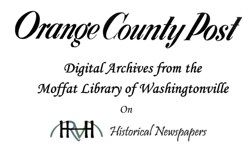 The Moffat Library of Washingtonville is thrilled to announce the archives of the Orange County Post, covering the years 1938 to 2012 are now available to view online via the Hudson River Valley Heritage at the HRVH website. Users can now search over 2,800 issues of the Orange County Post by Year, month and day, as well as keyword search for names, places and historic events as published in the Orange County Post - the only newspaper that exclusively covered Washingtonville and Blooming Grove! Please note, the library is still seeking back-issues of the Orange County Post covering the years 1943-1945, 1949, 1951-1952, 1954, 1958, 1960-1961, and 1967 in order to complete this collection. If you have issues covering these years that you can donate, please reach out to their Local History Librarian at moffat@rcls.org today!