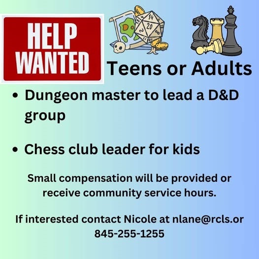 Teens Wanted! Contact Nicole at nlane@rcls.org for more information. Looking for teens to run a Dungeon & Dragons group and a chess club for kids. Small compensation will be provided or receive community service hours. Also looking for teen face painters and henna artists for our annual booksale on Saturday, June 7.
