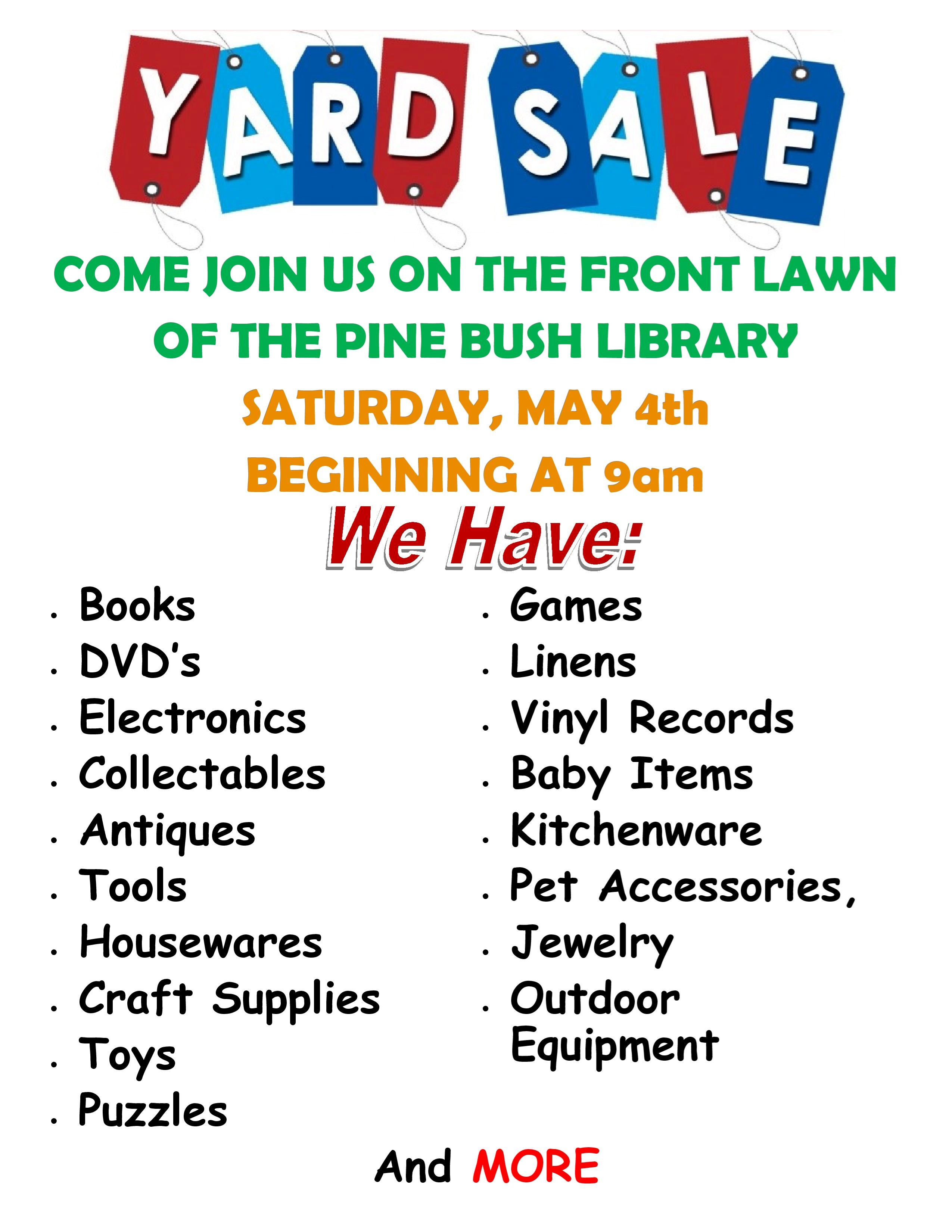 April 4/13: Trolleys From Middletown to Goshen with Ray Kelly 4/20: Defensive Driving 4/22: Earth Day Seed Planting May 5/4: Annual Library Yard Sale 5/11: O&W Railroad with Ray Kelly 5/15: Ticks and Tick Borne Diseases Presentation 5/18: Defensive Driving 5/29: Borscht Belt Culture with Alex Prizgintas