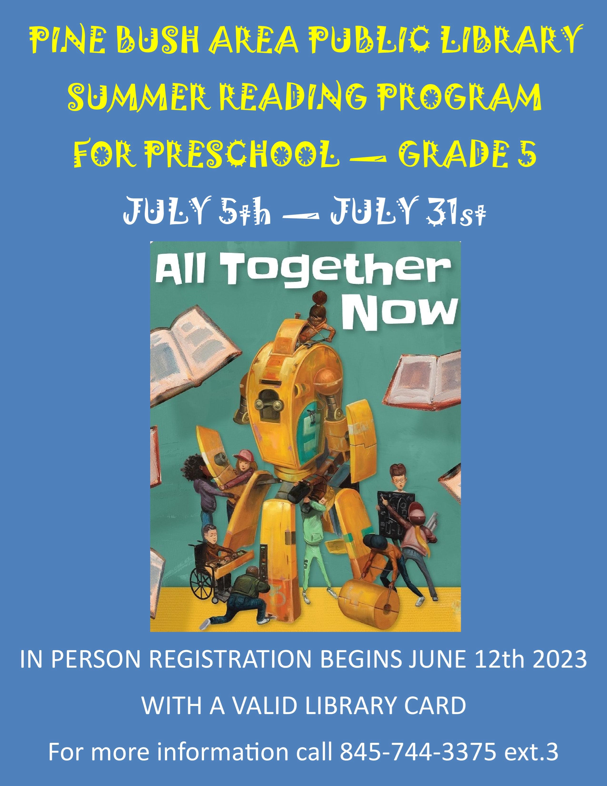 "ALL TOGETHER NOW" 2023 Summer Reading Program begins Wednesday, July 5! PRESCHOOL AGES 3 - 5 WITH MISS LUCY MONDAYS JULY 10 - 31, 10:30 AM. GOING INTO KINDERGARTEN - 2ND GRADE WITH MISS CHRISSY WEDNESDAYS JULY 5 - 26, 10:30 AM. CALL 845-744-3375 ext.3 TO REGISTER MUST BE REGISTERED IN ADVANCE...PLEASE NO DROP-INS!