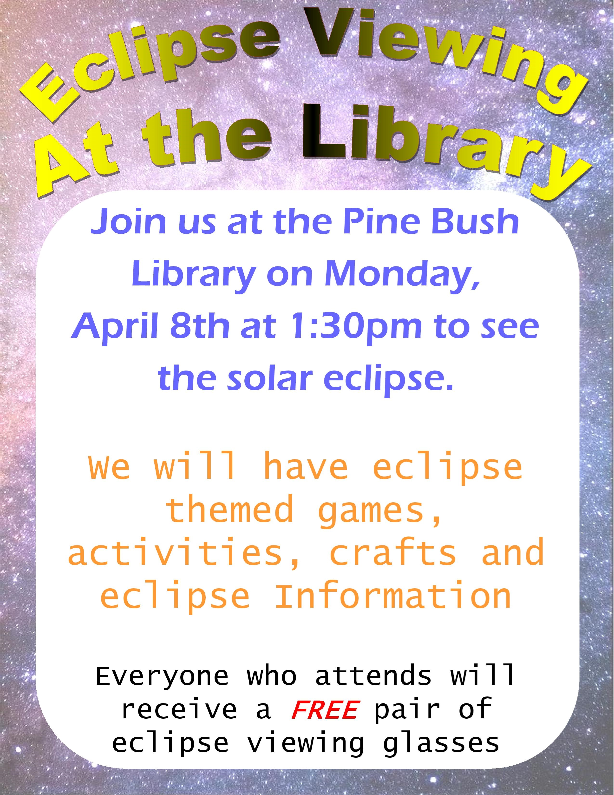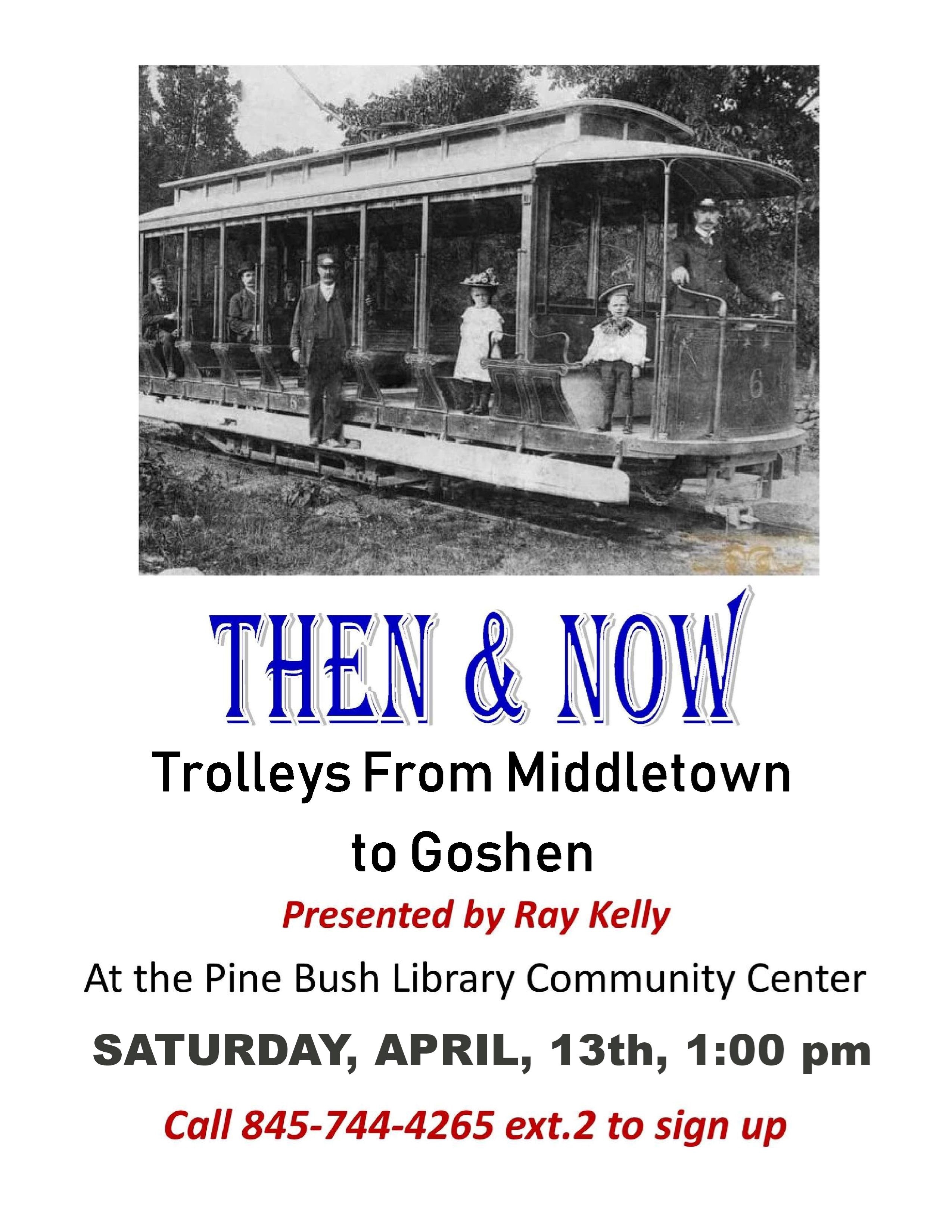 March 3/30: Easter Bake Sale April 4/8: Solar Eclipse Event 4/10: Estate Planning 4/13: Trolleys From Middletown to Goshen with Ray Kelly 4/17: Foraging with the DEC 4/20: Defensive Driving 4/22: Earth Day seed planting