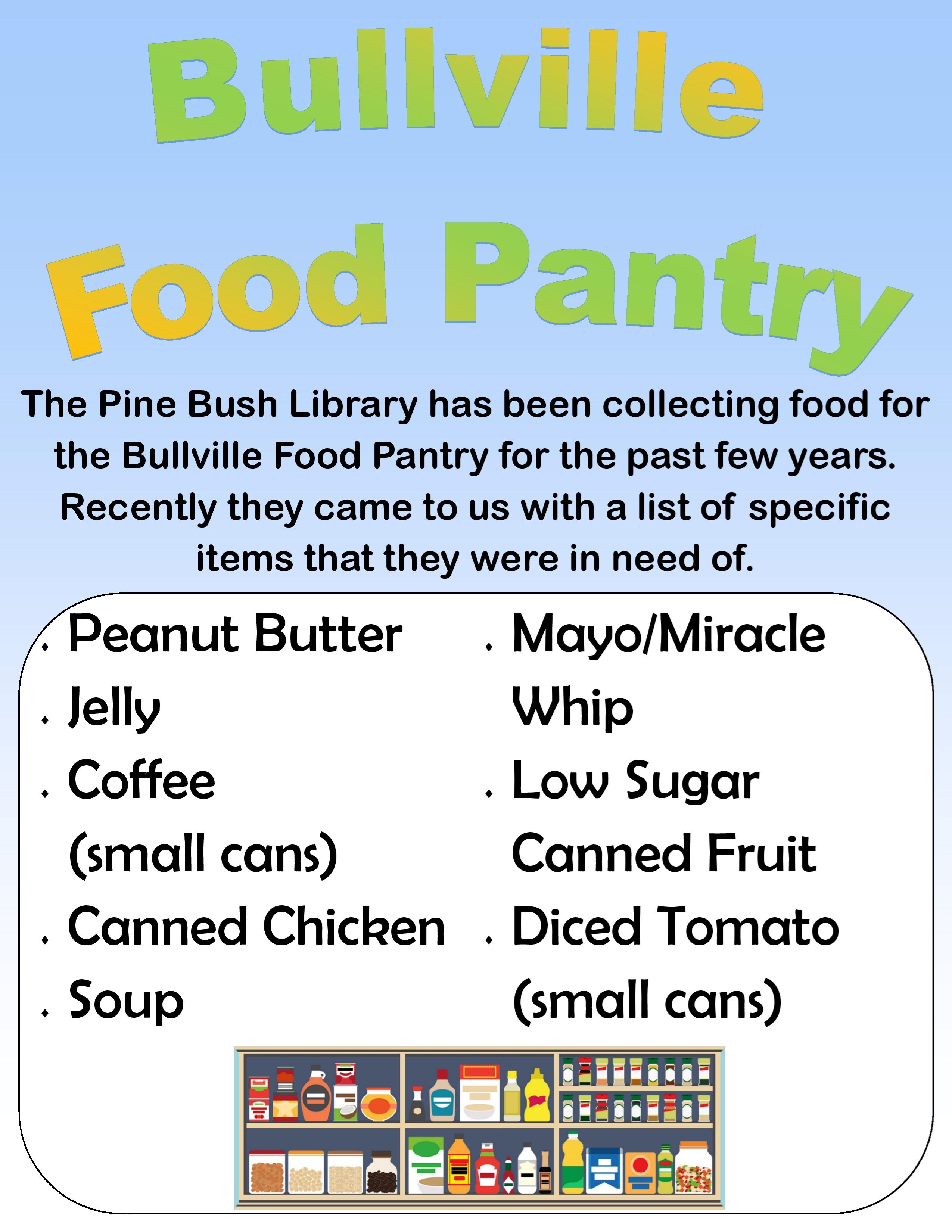 Here is a short list of the charitable initiatives we are currently a part of: Bullville Methodist Church Food Pantry We are collecting any and all food items as well as cleaning supplies, hygiene products, baby products, etc. Donations can be dropped off at either the main library or community center. Lions Club International Recycle For Sight You can drop off your gently used eye glasses in the collection box at the community center. Keep an eye on our website, Facebook page, and newsletter for any new opportunities to give back. If you have a charity or program you would like us to collect for or promote, please reach out by calling 845-744-4265 ext. 2, emailing PBL@rcls.org, or sending us a message on Facebook @PineBushPublicLibrary.