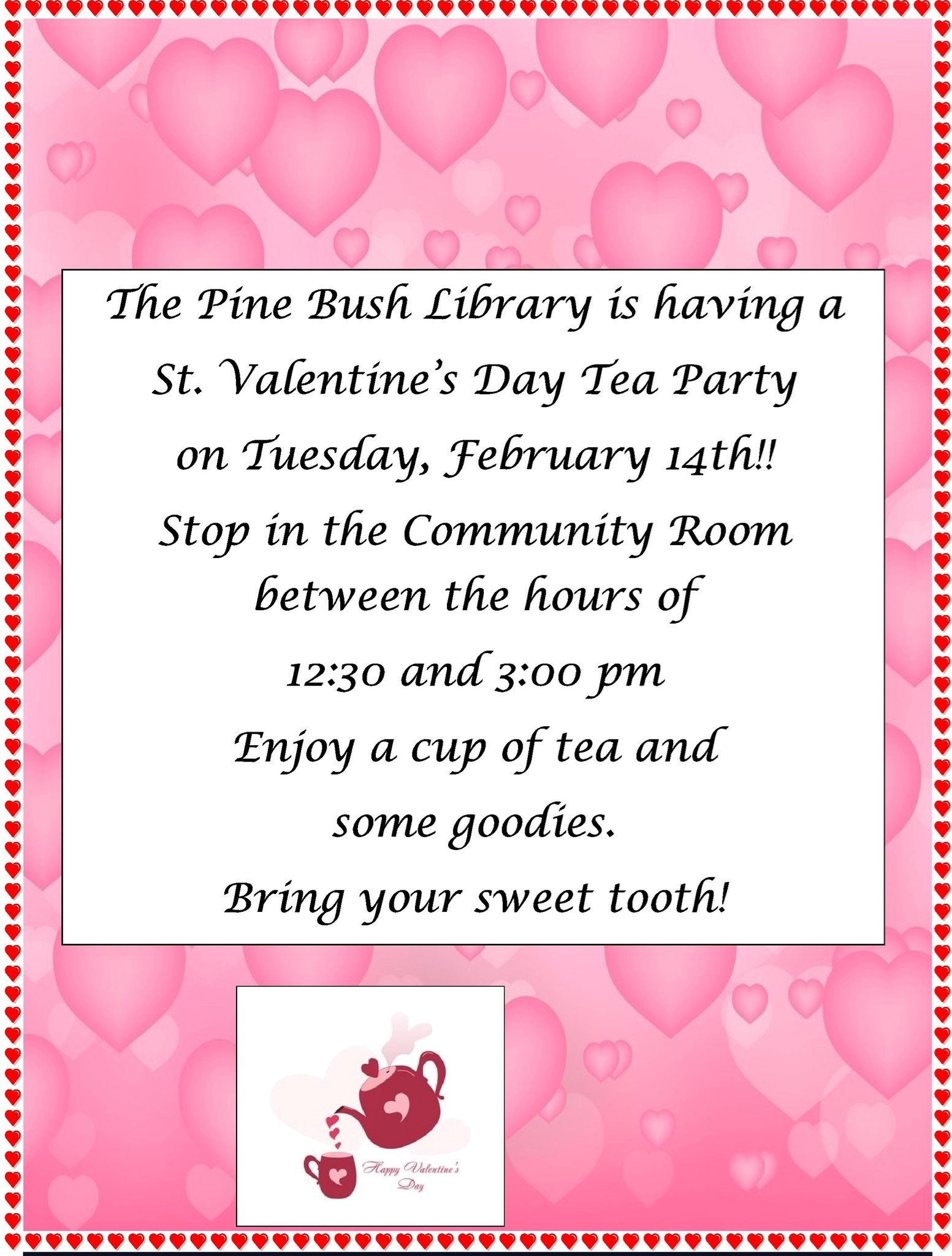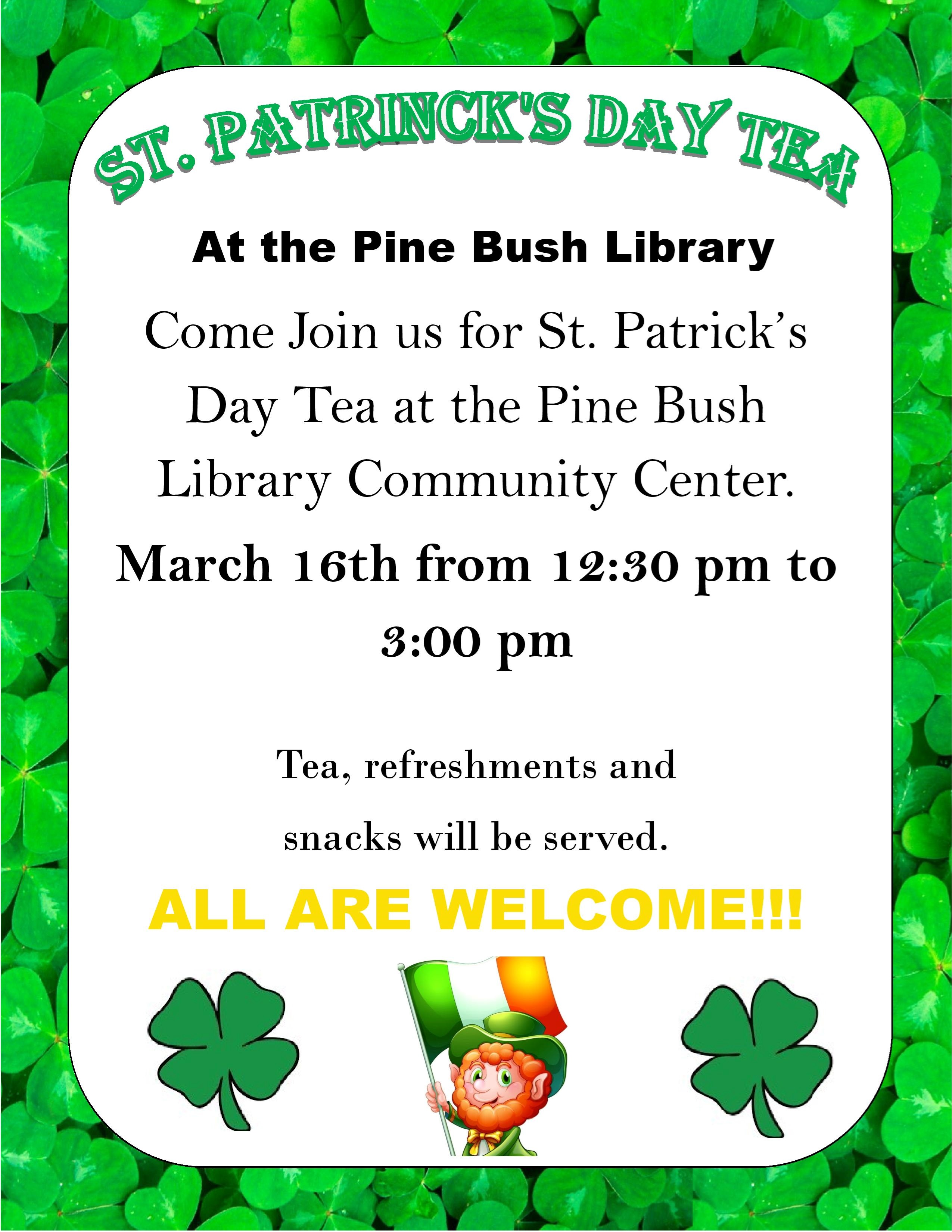 February 2/14: Valentines Day Tea Party 2/16: Honing your Psychic Abilities with Bill Wiand March 3/16: St. Patrick's Day Tea 3/22: Learn How Buy or Sell Your House with Michelle England 3/23: Meditation for Health and Wellness with Sue Wiand This is not a list of all the activities we have planned in the coming months and some of these dates are subject to change due to weather or other circumstances beyond our control. Any schedule changes will be posted on our Facebook Page and Website as soon as we are aware of them.