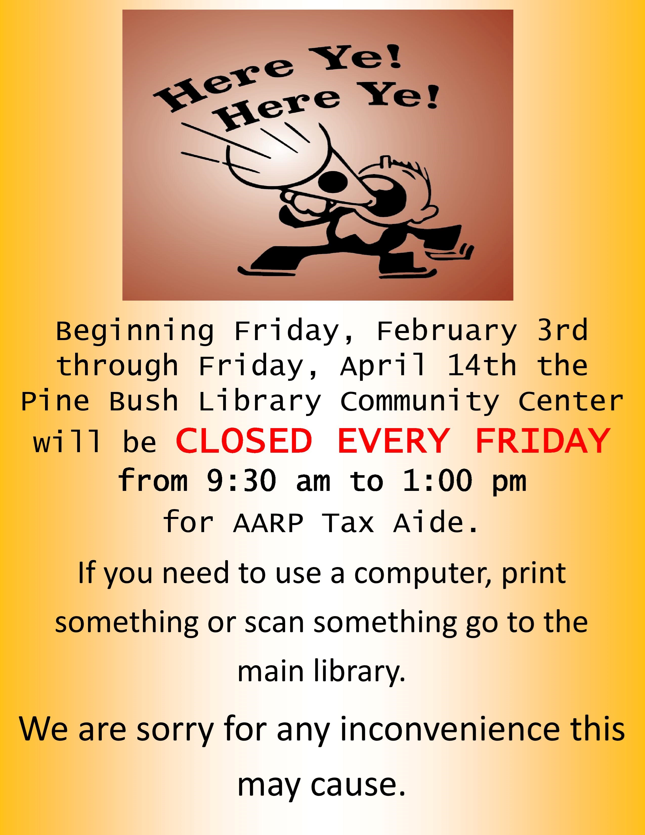 It's that time of year again!!!! AARP will be offering free basic tax preparation for seniors at the Pine Bush Library beginning on February 3rd. You can make an appointment to get your taxes done starting Monday, January 16th by calling 211 from any phone. Because this service is offered through AARP we here at the library CANNOT MAKE AN APPOINTMENT FOR YOU. The only way to get an appointment is by calling 211 and following the prompts. Here are a few helpful tips to make everything go as smoothly as possible. - DO NOT CALL THE LIBRARY FOR AN APPOINTMENT. Appointments are made by dialing 211.