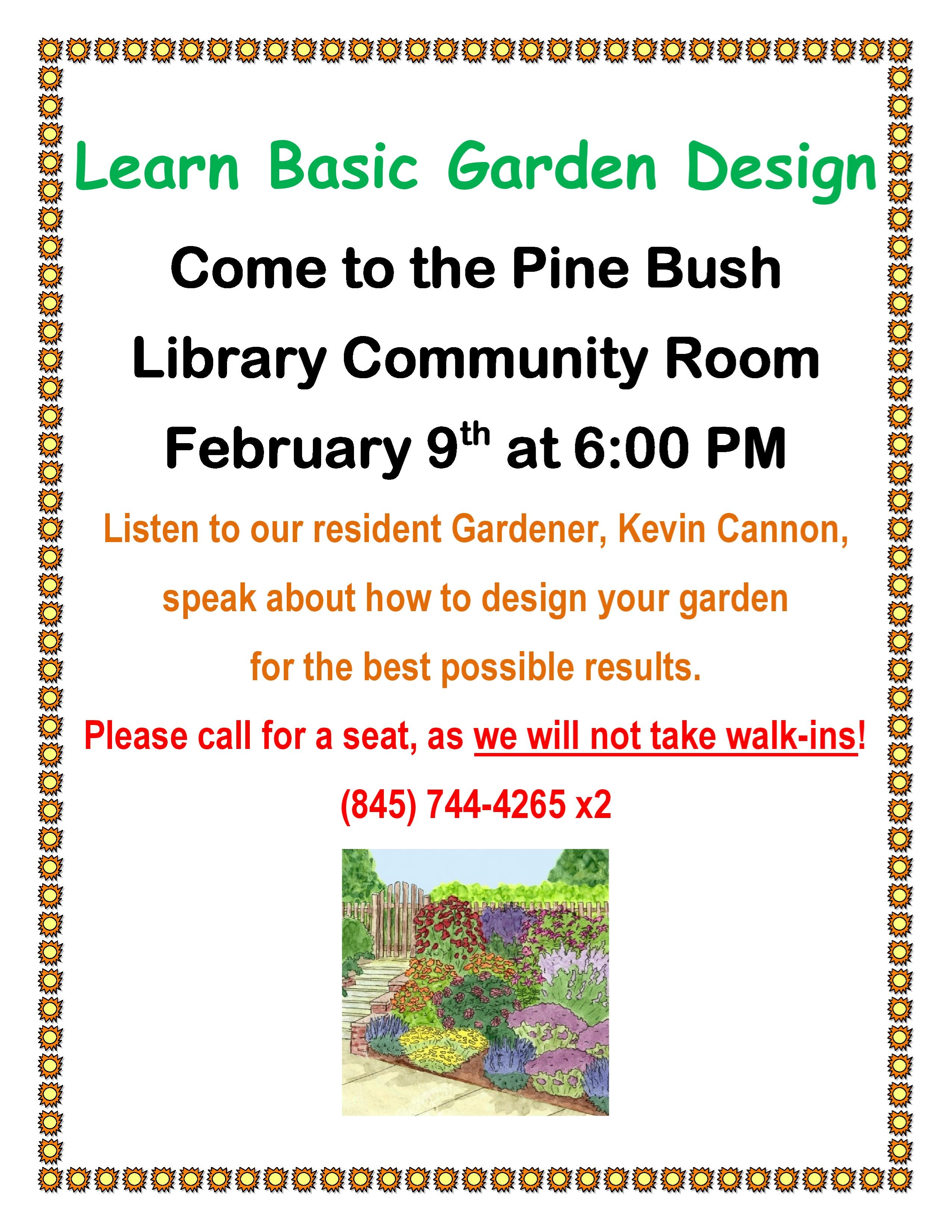 February 2/2: AARP Tax Aide Begins 2/6: Basic Garden Design with Kevin Cannon 2/14: Valentine's Day Tea March 3/4: Bingosize Begins 3/16: Newburgh Trolley Presentation Part: 1 with Ray Kelley 3/20: Financial Literacy "Understanding Credit"