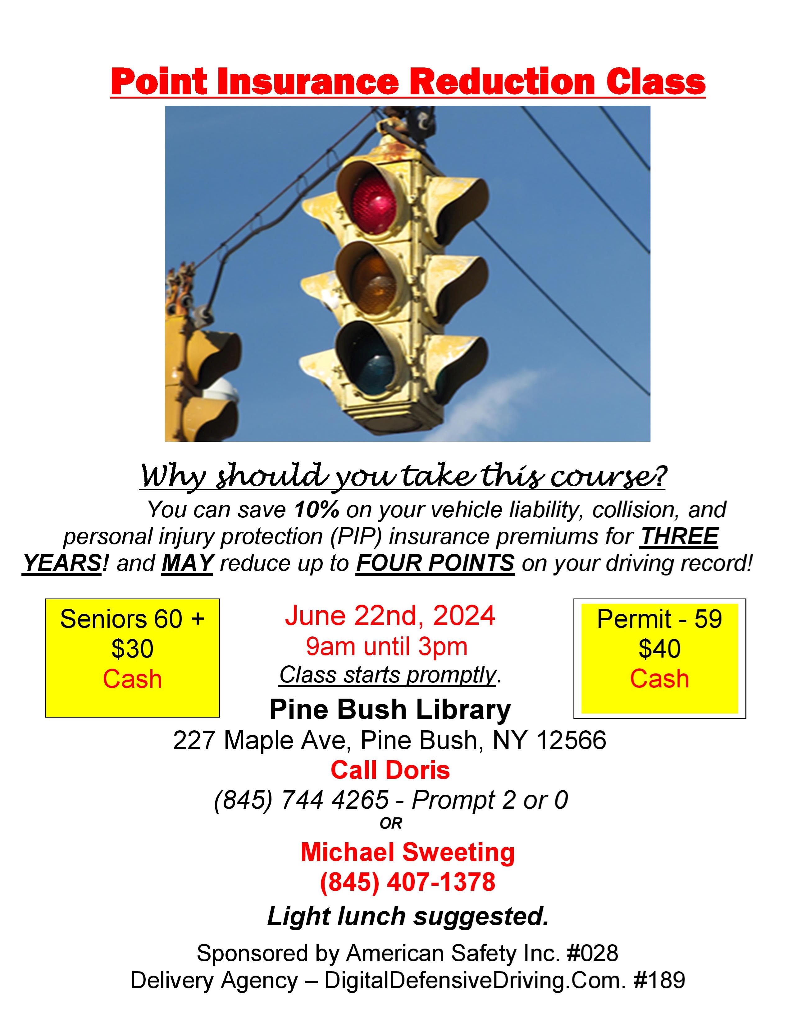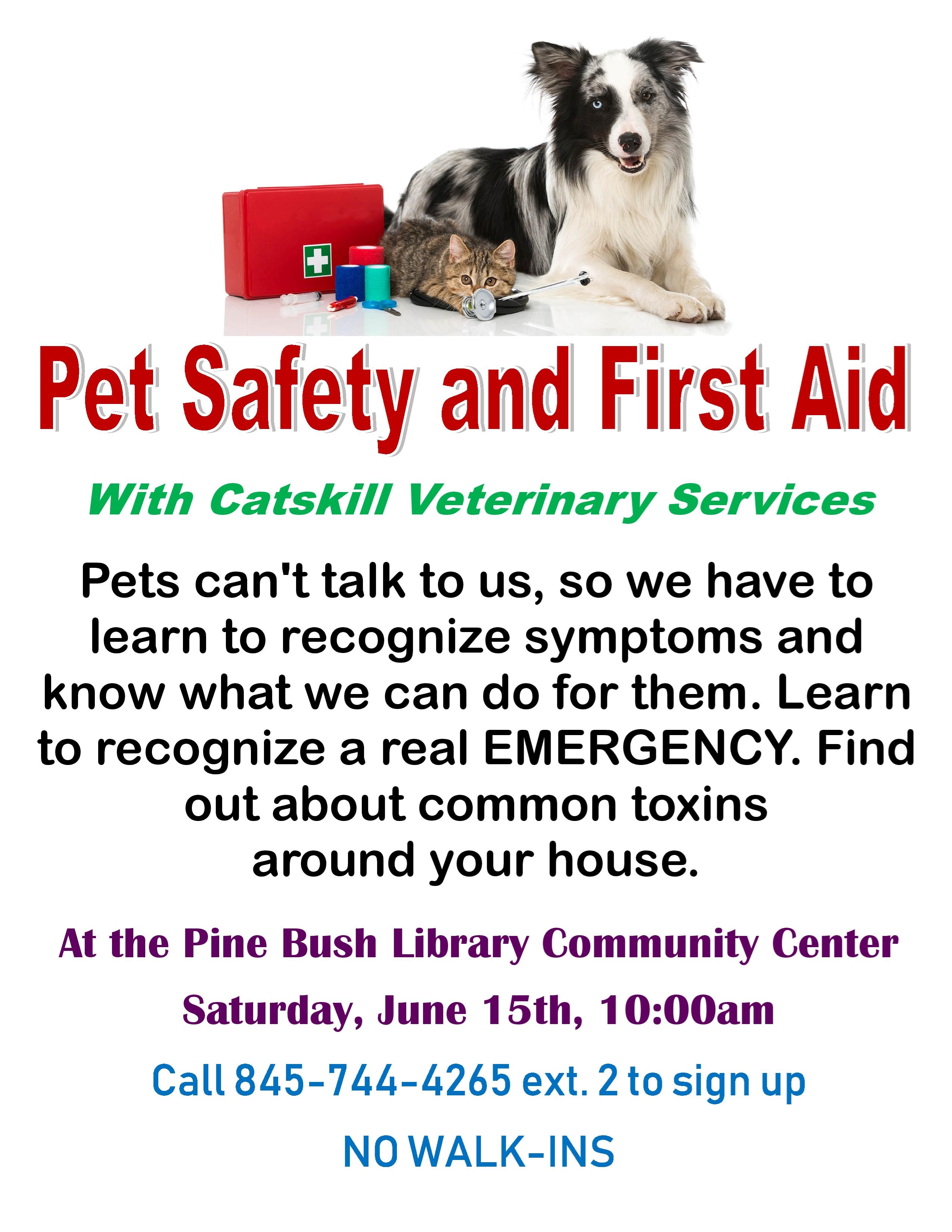 June 6/15: First Aid for Pets with Catskill Veterinary Service 6/22: Defensive Driving 6/26: The Trains to Pine Bush July 7/10: Trains to Pine Bush 7/27: Defensive Driving