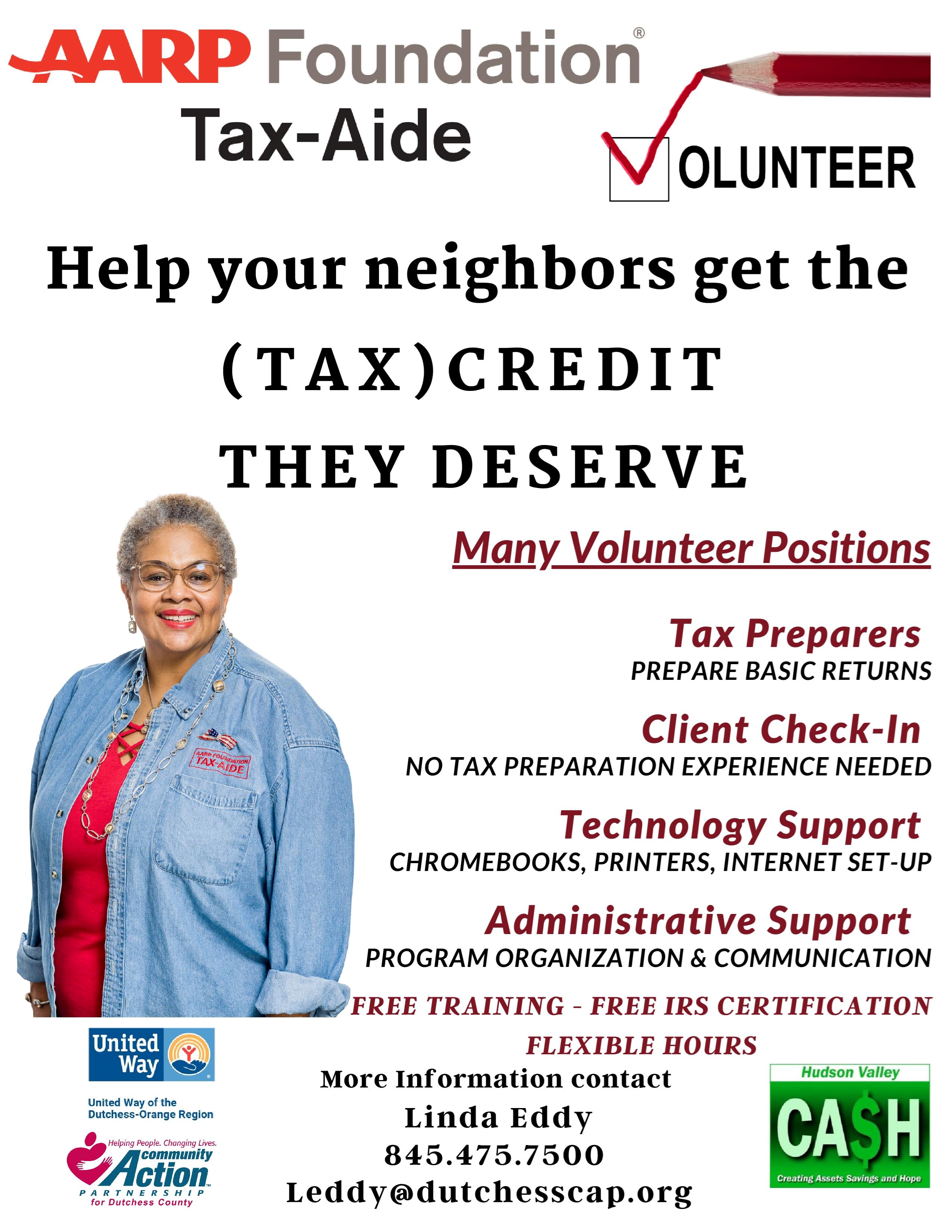 Hudson Valley CA$H Coalition and AARP Tax-Aide provide free tax preparation to low-to-moderate income residents. Volunteers are needed to continue to provide this support. Tax Counselor and other volunteer roles are available and free training is provided. For more information or to volunteer, contact Linda Eddy at 845-475-7500.