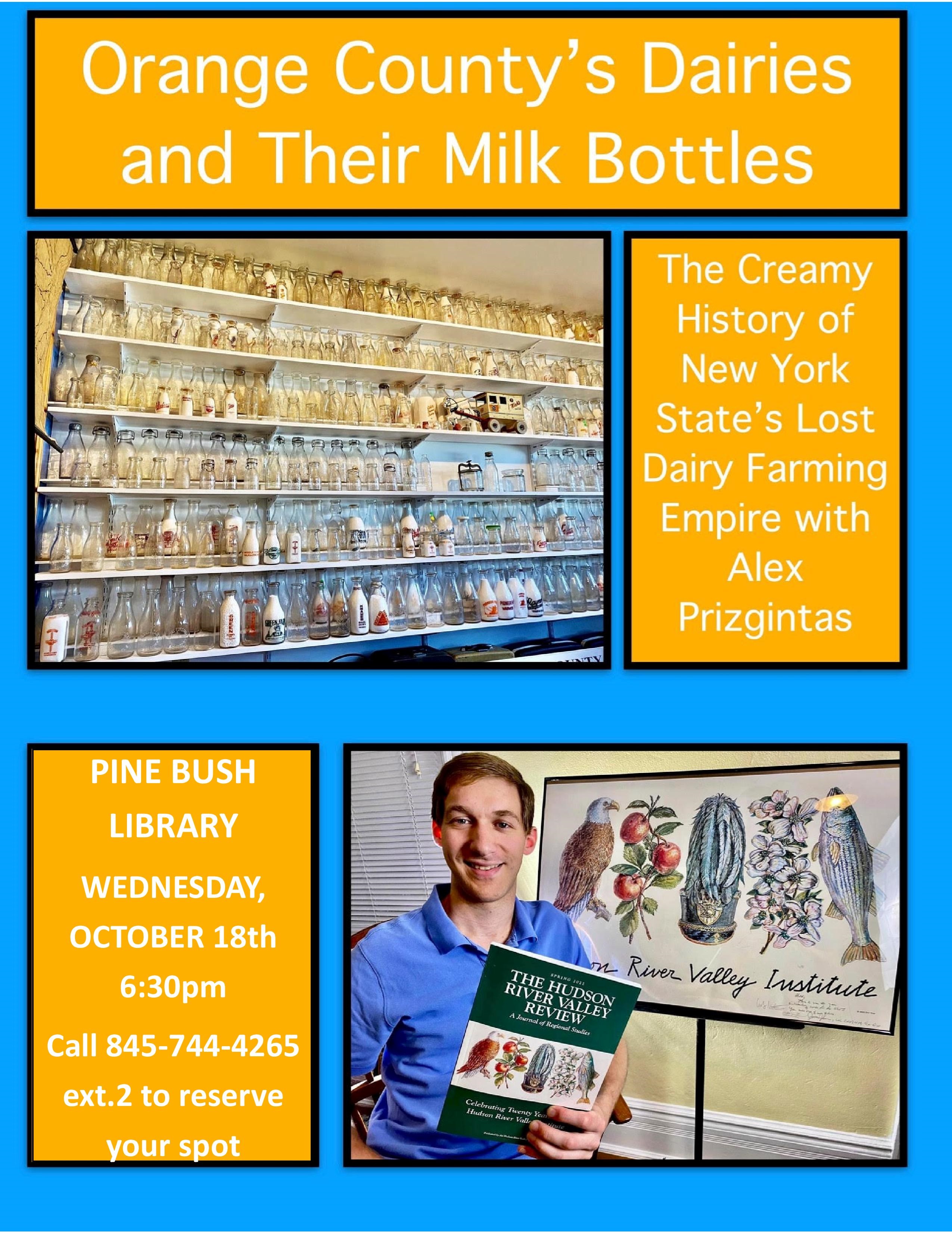 Join Alex Prizgintas at the Pine Bush Area Public Library on Wednesday, October 18th at 6:30 PM as he uncovers Orange County, New York’s role in the consumer use of fluid milk. Individuals instrumental in this creamy saga, from Erie Railroad station agent Thaddeus Selleck who first shipped milk by rail in 1842 to milk can pioneer Jacob Vail and the early milk bottle user Alexander Campbell all had close connections to the Hudson Valley.