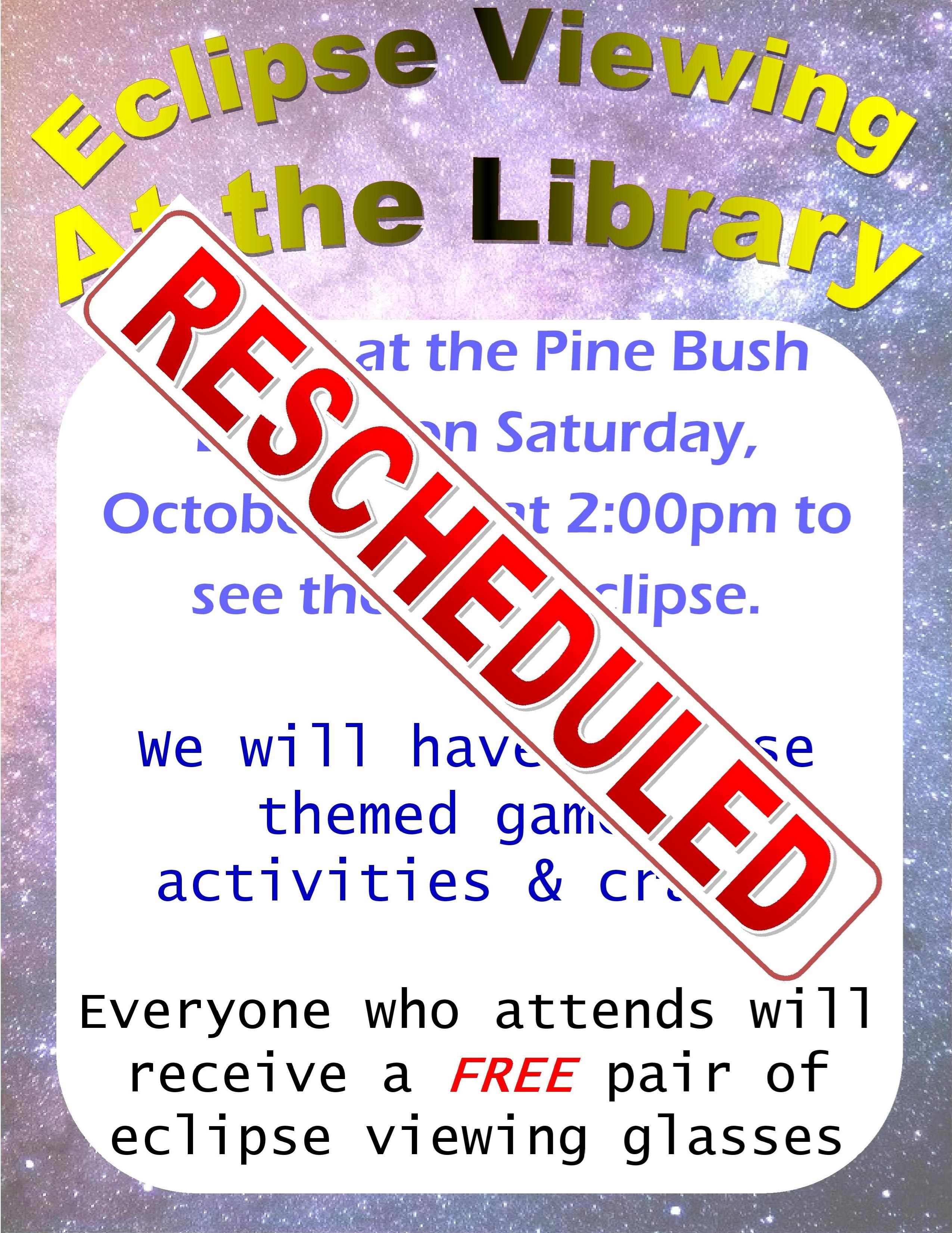 Due to circumstances beyond our control we were forced to reschedule our eclipse viewing event. The new date is Monday, April 8th, 2024. We were trying to reschedule it for an earlier date but unfortunately manipulating the cosmos is not in the library mandate.