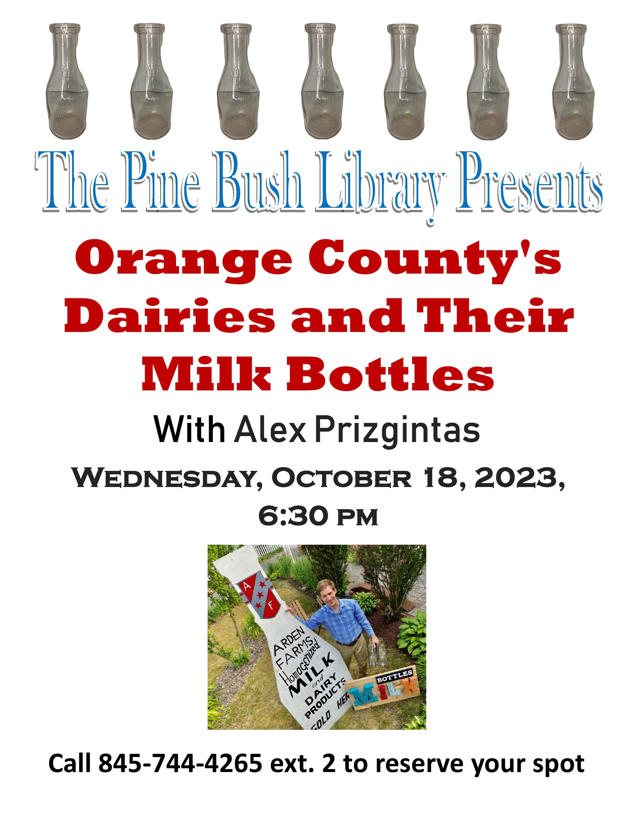 Join Alex Prizgintas at the Pine Bush Area Public Library on Wednesday, October 18th at 6:30 PM as he uncovers Orange County, New York’s role in the consumer use of fluid milk. Individuals instrumental in this creamy saga, from Erie Railroad station agent Thaddeus Selleck who first shipped milk by rail in 1842 to milk can pioneer Jacob Vail and the early milk bottle user Alexander Campbell all had close connections to the Hudson Valley.