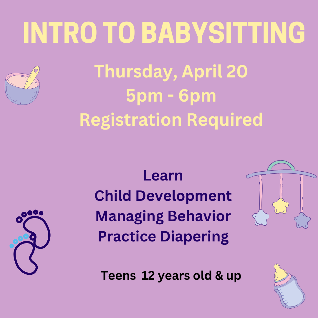 For ages 12-17Students learn tips to manage behavior that will help them stay in control of themselves and the children in their care. Students also learn the ages and stages of child development, as well as practicing diapering. An electronic Certificate of Completion will be given at the end of the program. REGISTER HERE