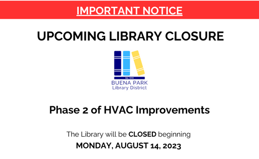 The Buena Park Library District will be closing for approximately four weeks, beginning on August 14, 2023, to complete the heating, ventilation, and air conditioning (HVAC) construction project that began last summer.