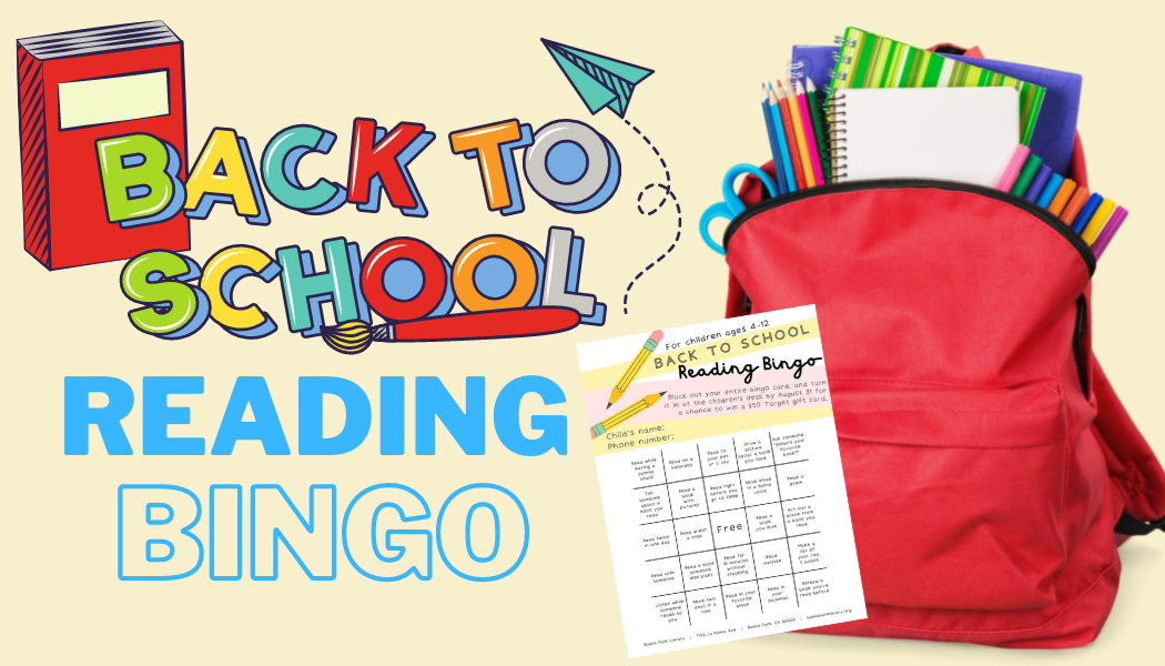 Back to School Reading Bingo Monday, August 8th-Friday, Sept. 30th Kids ages 4-12, play black out bingo with the library for a chance to win a Target gift card. Click here to download your bingo card and complete all the activities. Then, send a picture of your blacked out bingo card to rcho@buenaparklibrary.org by September 30, or turn it in at the children's desk between September 12-30. Winners will be contacted in early October.