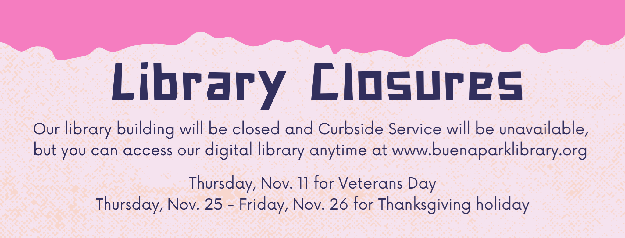 Sunshine Storytime Wednesdays at 10:30AM Library Front Lawn, weather permittingEvery Wednesday from 10:30AM – 11:00AM, we will have outdoor storytime on our front lawn with Miss Shailene. Bring your own blankets/chairs and join in on the fun. No reservations necessary. **Weather permitting. This program will be canceled in the event of rain or extreme heat.** There will be no Sunshine Storytime on Nov. 24th.