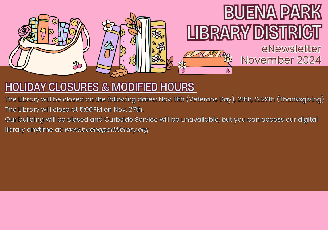 Orange County Vote CenterSaturday: Nov. 2nd - Tuesday: Nov. 5th Second-Floor Multipurpose RoomThe Buena Park Library will be an Orange County Vote Center from November 2nd - November 5th. Voting will be held in our Multipurpose Room on the second floor. Hours: Saturday 11/2: 8:00AM-8:00PM Sunday 11/3: 8:00AM-8:00PM Monday 11/4: 8:00AM-8:00PM Tuesday 11/5 (Election Day) : 7:00AM-8:00PM For more information on voting in Orange County,