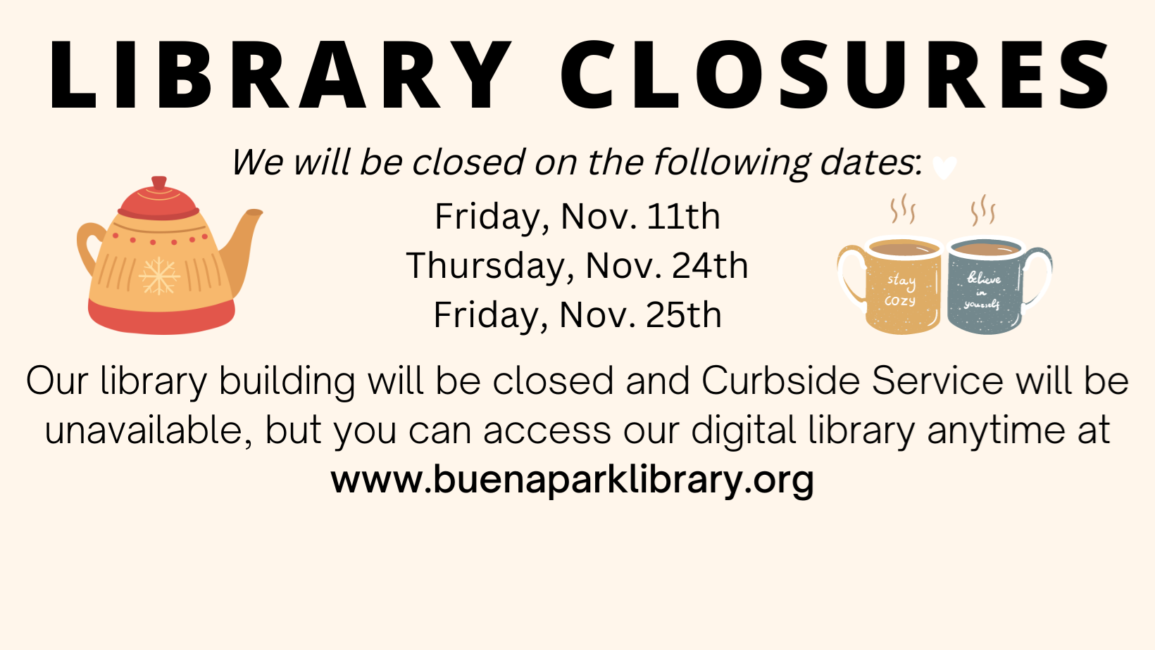 But the journey into the past does not come without risks: customers must sit in a particular seat, they cannot leave the café, and finally, they must return to the present before the coffee gets cold. No registration is required. Ages 18+ Please contact Helen at 714-826-4100 ext. 172 or email hkoo@buenaparklibrary.org if you have any questions.