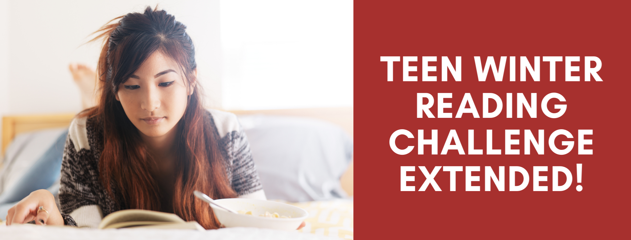 Teen Winter Reading Challenge Jan. 4th - Feb. 15th Teens ages 12-18 can join our online Teen Winter Reads program for chances to win prizes! Read up to ten books to be eligible to win one of eight book bundles! For each title finished, write a one or two sentence review and receive an entry for a prize.