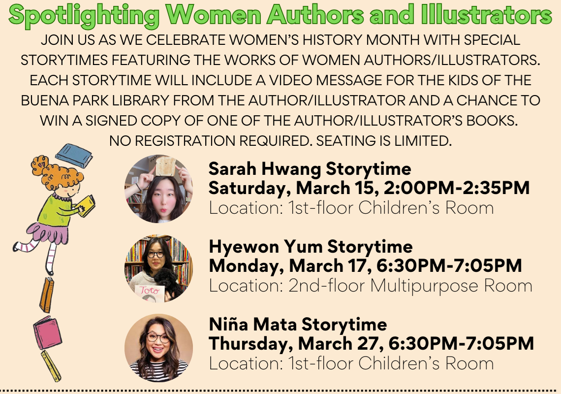 Family Storytime Saturdays: March 1, 8, 15, 22, 29 10:00AM-10:30AM Second-Floor Multipurpose Room Listen to stories, sing, and meet friends. All ages are welcome. No registration is required. Caregivers must accompany children 10 years of age and younger.
