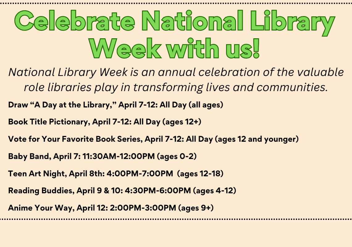 Tuesday: April 8, 4:00PM-7:00PM First-Floor Teen Space Celebrate National Library Week’s “Drawn to The Library” with some sketching, doodling, painting and more! We will have a shared art challenge, a design of your own bookmark station, and free art to create as much as you’d like. All materials will be provided. Come vibe and create with us!