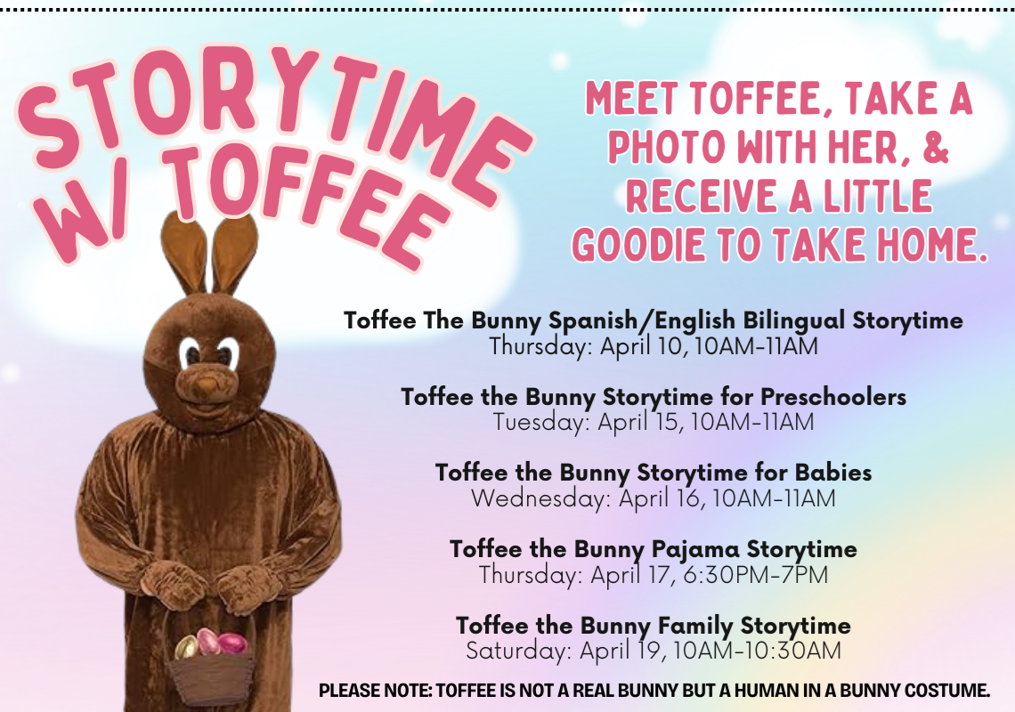 Spanish/English Bilingual Storytime Thursdays: April 10 & 24 10:00AM-11:00AM Second-Floor Multipurpose Room Join us for songs and stories in Spanish and English and enjoy a time of free play. Fun for the whole family! Special guest Toffee the Bunny will be at the April 10th meeting! We will be dancing, singing, and taking pictures with all the children and their caregivers. We’re excited to share this wonderful experience with everyone! Please note: Toffee is not a real bunny but a human in a bunny costume. No registration is required. Caregivers must accompany children 10 years of age and younger.