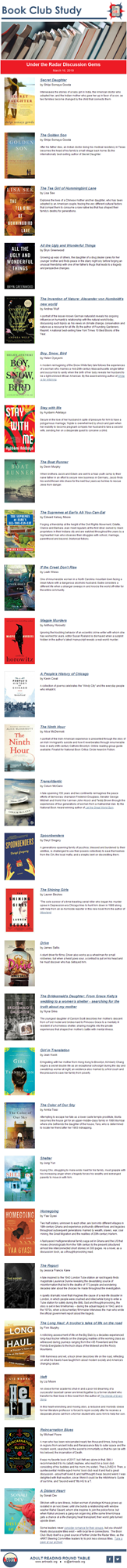 Please arrange to obtain your own copy of the book for the discussion. As always, discussion of the book includes a nuts-and-bolts session devoted to sharing practical solutions to the problems and concerns of book discussion leaders. Nicole Steeves will lead the discussion on our next leadership topic: How do you prepare for book discussions? Please bring a list of resources you utilize and be prepared to share your best practices so that we can all learn from each other.
