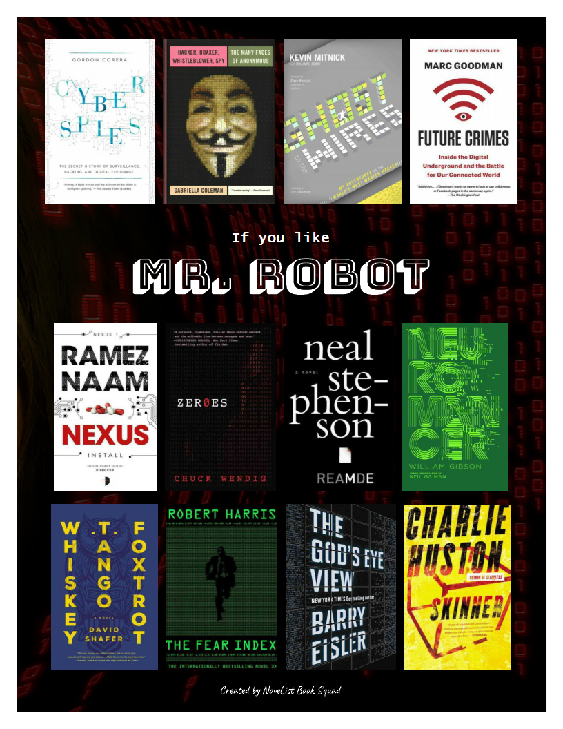 If you like...Mr. Robot (Includes nonfiction!) This flyer collects books that may appeal to fans of Mr. Robot, as well as readers interested in topics such as emerging technologies, cybersecurity and digital surveillance, hackers, Internet culture, cyberterrorism and hactivism. As always, LibraryAware customers can swap out any and all titles to reflect library collections.