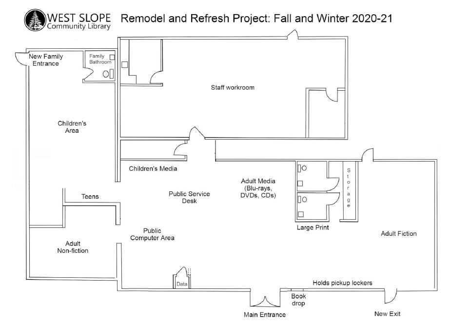 Greetings! Our beloved West Slope Library is getting a much-needed refreshed interior. And – even more exciting – it won’t be limited to just carpet, paint and new furniture (although as you know, those are badly needed). We’ll also be able to create a new layout that will open up lots of new opportunities and services for patrons. Here are a few of the changes you’ll notice right away: