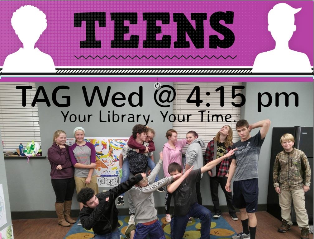 Middle & High School Students, come on Wednesdays at 4:15 p.m. for a free program just for you! Help us shape the program for the upcoming months by suggesting new group names and joining in a vote on September 11. An ongoing reading challenge began last week and will run through the end of next May. Reading prizes and books will be awarded for every 500 pages of reading. The August & September meetings will run as follows: August 21, 4-6 pm: Games & Snacks Night at the Library August 28, 4:15-5 pm: Book Club at the Keyhole September 4, 4-5 pm: Community Service at the Library September 11, 4:15-5 pm: Arts & Crafts at the Library September 18, 4-6 pm: Games & Snacks Night at the Library July 24, 4:15-5 pm: Book Club at the Keyhole September 25, 4:15-5 pm: Book Club at the Keyhole Need a ride from public school to TAG? Parents or guardians, call Jo Allen at 223-0800 to arrange bus transportation for your student.