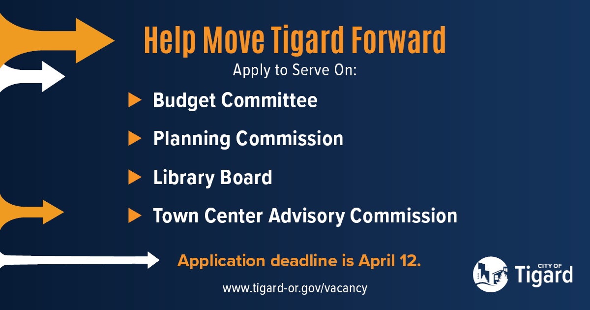 Board and committee members are key to informing the development of Tigard's programs and policies. These volunteers dedicate time and expertise to serve as an important link to community needs and represent community values. The City of Tigard is currently accepting applications for: - Budget Committee