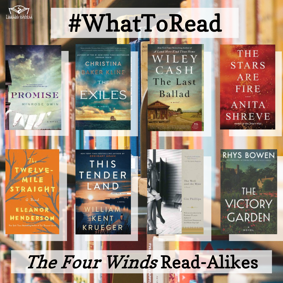 Are you waiting for a copy of Kristin Hannah’s latest bestselling historical fiction novel, The Four Winds? Here is a list of read-alikes you can read while you wait. Find staff-recommended sweeping historical fiction set in times of hardship below. Click on a title to place a hold or to find electronic copies to download.