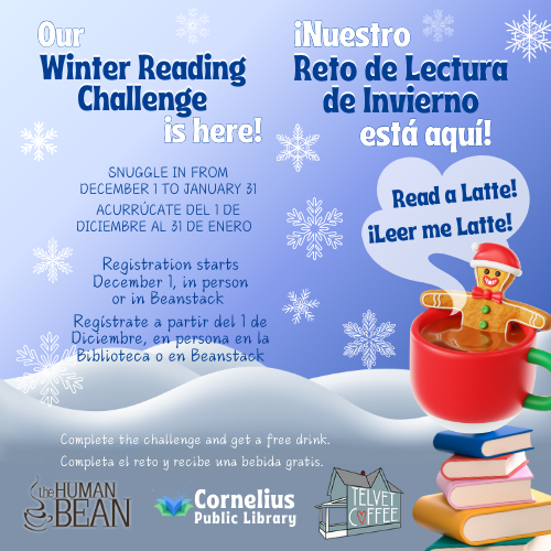 Reto de Lectura de Invierno ¡No olvides inscribirte en nuestro Reto de Lectura de Invierno! Lee durante 30 días entre diciembre y finales de enero para obtener una tarjeta de regalo gratis para The Human Bean o Telvet Coffee. Incluso puedes contar los días que leíste en diciembre antes de inscribirte, así que si lees durante 30 días entre el 1 de diciembre y el 31 de enero, ¡recibirás tu café gratis! Haz clic en la imagen para registrarte en línea o ven a la biblioteca y consigue un registro de lectura.