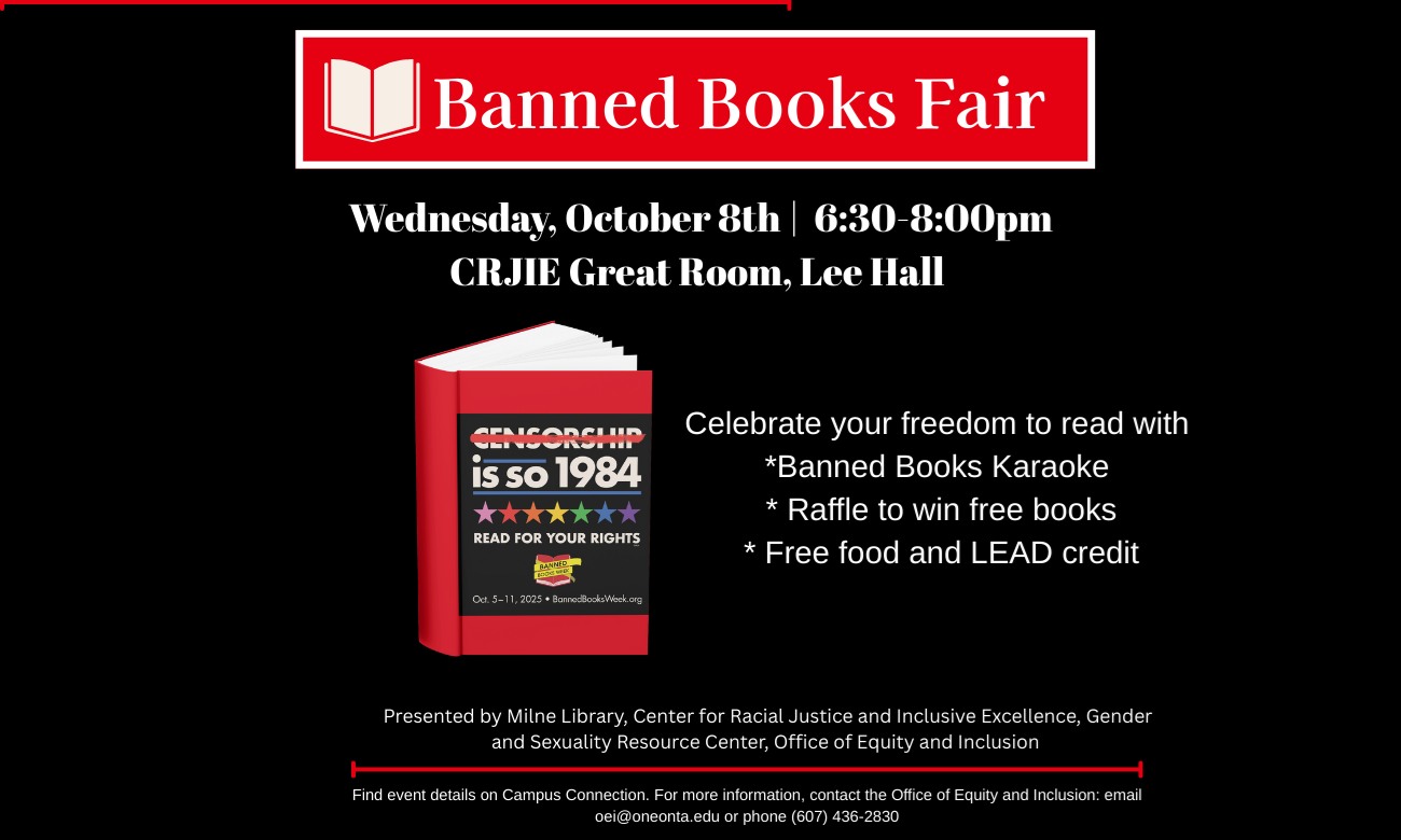 Celebrate the freedom to read at the Banned Book Fair at SUNY Oneonta! Enjoy banned book karaoke, enter our raffle for a chance to win free books, and grab some delicious food.