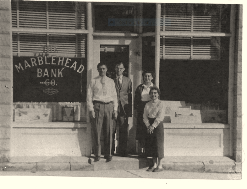 by Lorrie Halblaub In this series we are taking an historical look at an area that covers approximately a mile of Main Street in downtown Marblehead. Heading east from the Village limits, we will discover the facts and the stories of how Marblehead became what it is today. [This is the 9th article in the series.] The next building at 806 West Main Street, east of Madam Rosie’s Boutique and Gallery, has had many uses. It was once Brown’s Department Store, Bob Anderson’s electric shop, the home of Celia Grover who earned her living as a seamstress. Then it was Pitzer’s Pizza and Subs, Bill Hammond’s Pizza and video rental store, The Village Peddler- Antiques and Such, La Habana a Cuban Restaurant, the art Gallery of Bailey Van Kirk , the office of Nature Conservancy and is now, again, a private home. This one building is a good example of the evolution of Marblehead. Before the Bay Bridge connected the Marblehead Peninsula with Bay View and made Sandusky a destination accessible by car instead of by ferry or train, shops in Marblehead sold practical things that people needed, like fuel oil, tires, clothing, shoes, kitchen utensils, bolts of cloth for sewing, etc. However, with the bridge, it was easier to get to Sandusky where there were larger stores with more variety in their inventory. Over the years, Marblehead shops changed to restaurants, gift shops, and art galleries. Marblehead slowly evolved into the tourist-based seasonal economy that it is today. However, not all practical businesses changed. The next building on the corner of Main and James St., 802 West Main St., was built by Louis St. Marie in 1895 out of the formed concrete blocks sold by the quarry. It was the first site of the Marblehead Bank founded in 1907. Louis St. Marie was the first president of that bank, and it remained at this site until 1957 when they built a larger bank on the south side of Main Street. The bank only took up half of the downstairs of the St. Marie building. The other half was George Ward’s Grocery Store. When the bank moved across the street, the Knights of Columbus took their space. The upstairs of that building was once a dance hall, then a lawyer’s office, and for a while a vinyl graphic’s business run by Drew Jenkins. Since 1992, Marblehead Mayor John Starcher owns the whole building and the downstairs is Village Pro Hardware. The Marblehead Bank on the south side of the street at 709 West Main Street has had one enlargement since they moved to this spot and celebrated the 100th Anniversary of the founding in 2007. This bank annually receives Bauer’s Five Star Ratings and is one of the safest banks in America and even staying solvent during the Great Depression. This year it merged with State Bank and Trust Company of Defiance, OH. The well-respected State Bank specializes in community banks and both banks assure customers they will enjoy additional products and services. Photo of the Marblehead Bank when it was in the Starcher Hardware Building. L-R Bank employees: John Danchisen, Truman Carnicom, Josephine Monak and Barbara Halblaub. You can use this link to read or share this article: Lorrie |