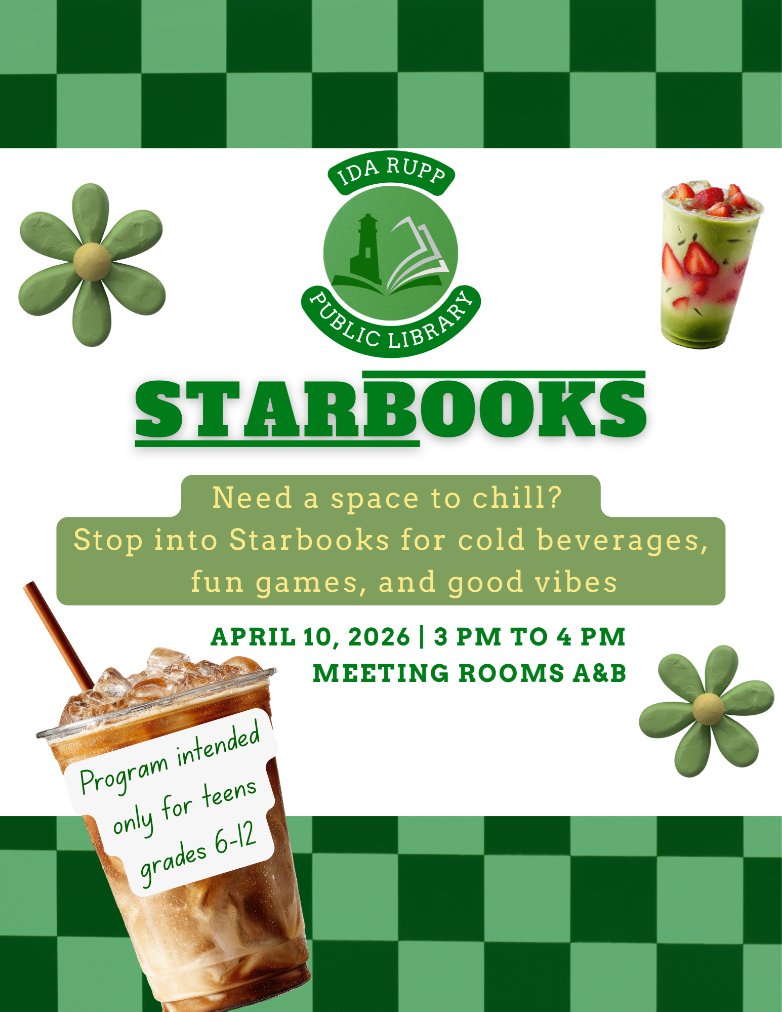 Starbooks Date: Friday, April 10 @ 3:00-4:00 p.m. Location: Ida Rupp Public Library Ages : Grades 6-12 Need a space to hang with friends, study, or just relax after school? Come visit Starbooks at your Ida Rupp Public Library! Starbooks offers handcrafted drinks, tasty snacks, and low-energy activities to recharge after a long day. Bring your friends and learn a new card game, bring your laptop to study, or snag one of our newest books to read. Feeling crafty? Use air-dry clay to make your own Lucky Charm! Drinks, snacks, and activities are all FREE so stop by your local Starbooks! *Program intended only for Grades 6-12. *All materials provided, while supplies last *No registration required