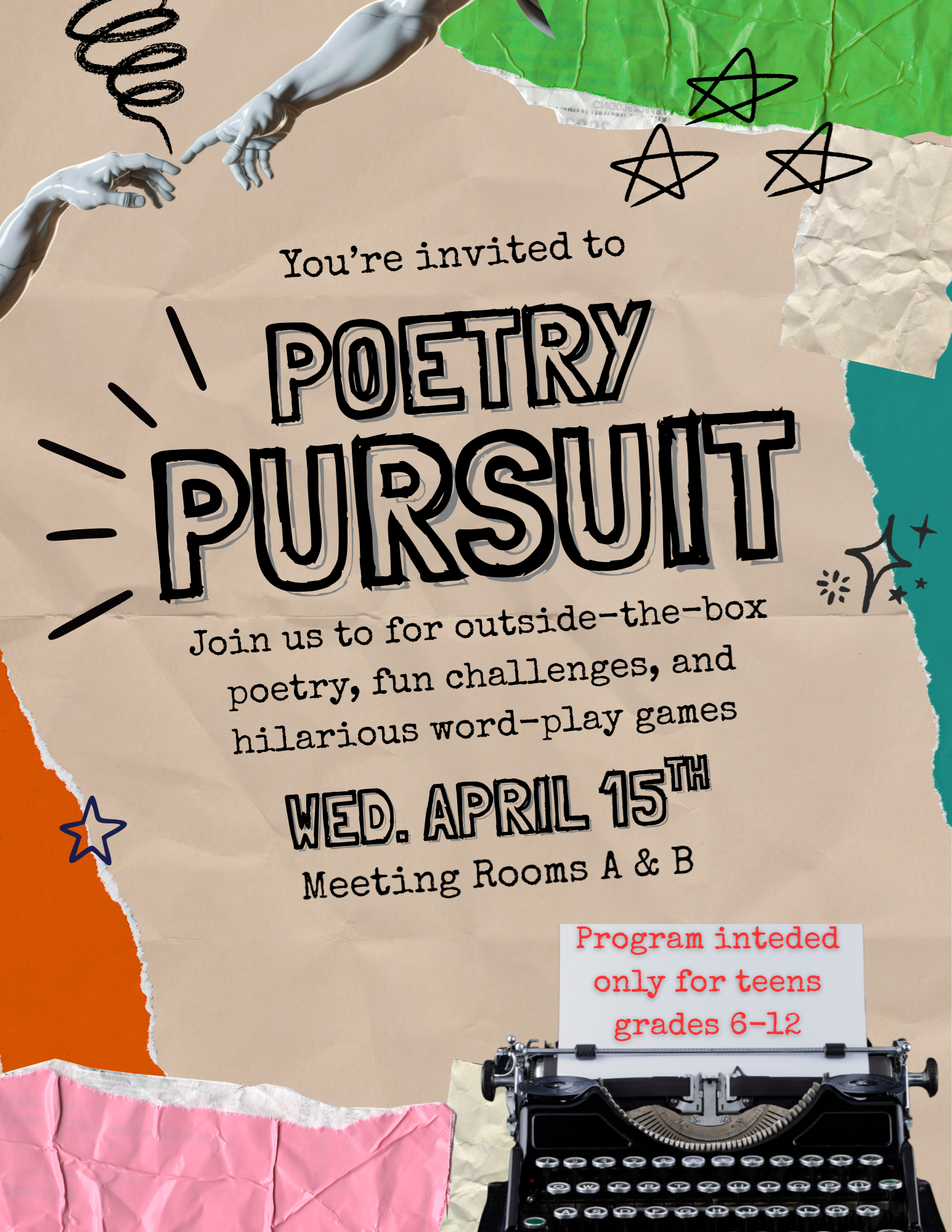 Poetry Pursuit Date: Wednesday, April 15th @ 3:30-4:30 p.m. Location: Ida Rupp Public Library Ages : Grades 6-12 Poetry doesn’t have to be prim and proper. At Poetry Pursuit, we are taking poetry outside the box with games and challenges that will pique your poetic interests and get you thinking about prose from a new perspective. So, leave traditional English class at school, and let’s celebrate National Poetry Month with Poetry Pursuit at Ida Rupp! *Program intended only for Grades 6-12. *All supplies provided *No registration required