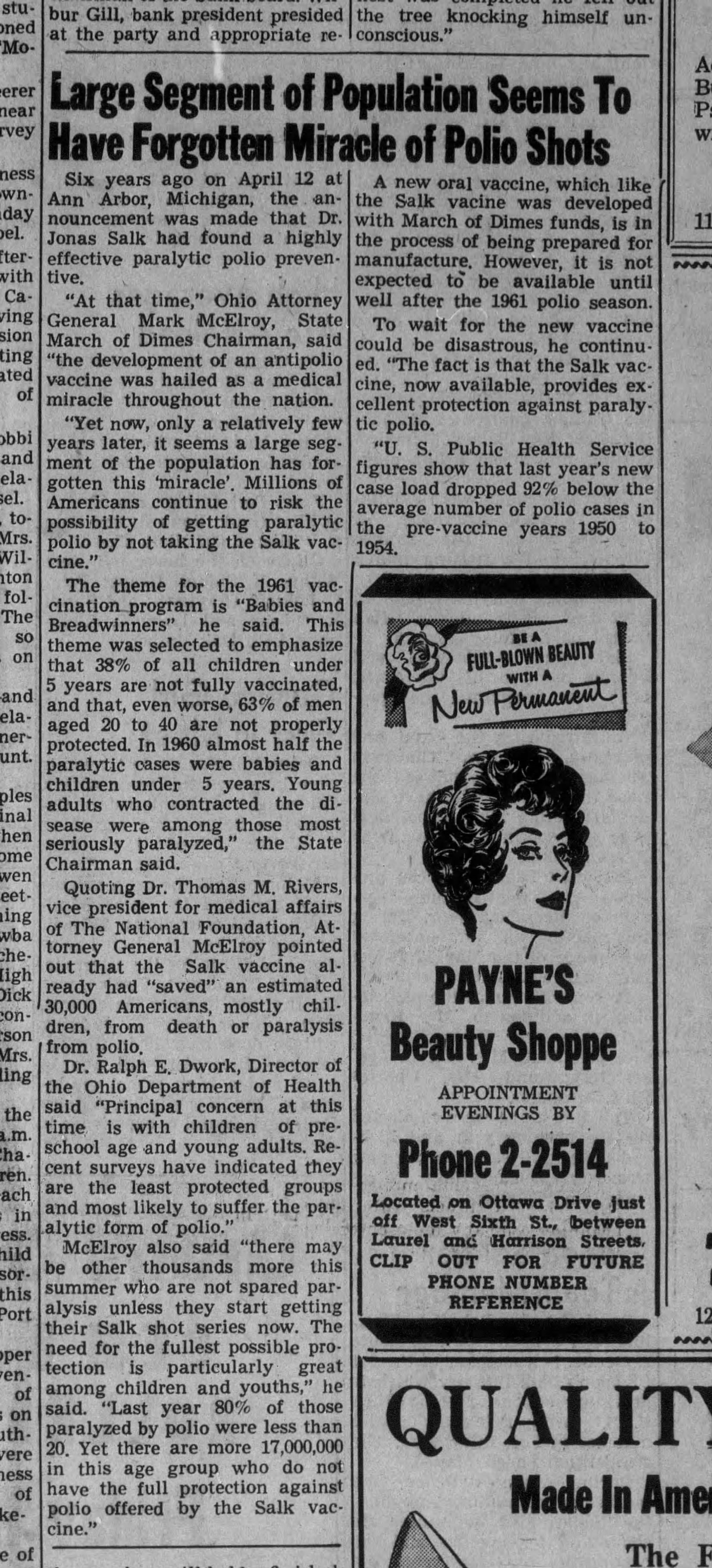 There was one documented case in Port Clinton in 1944. Then, in 1948, the epidemic hit the Port Clinton community with full force. Among others, five members of the PCHS football team were infected.