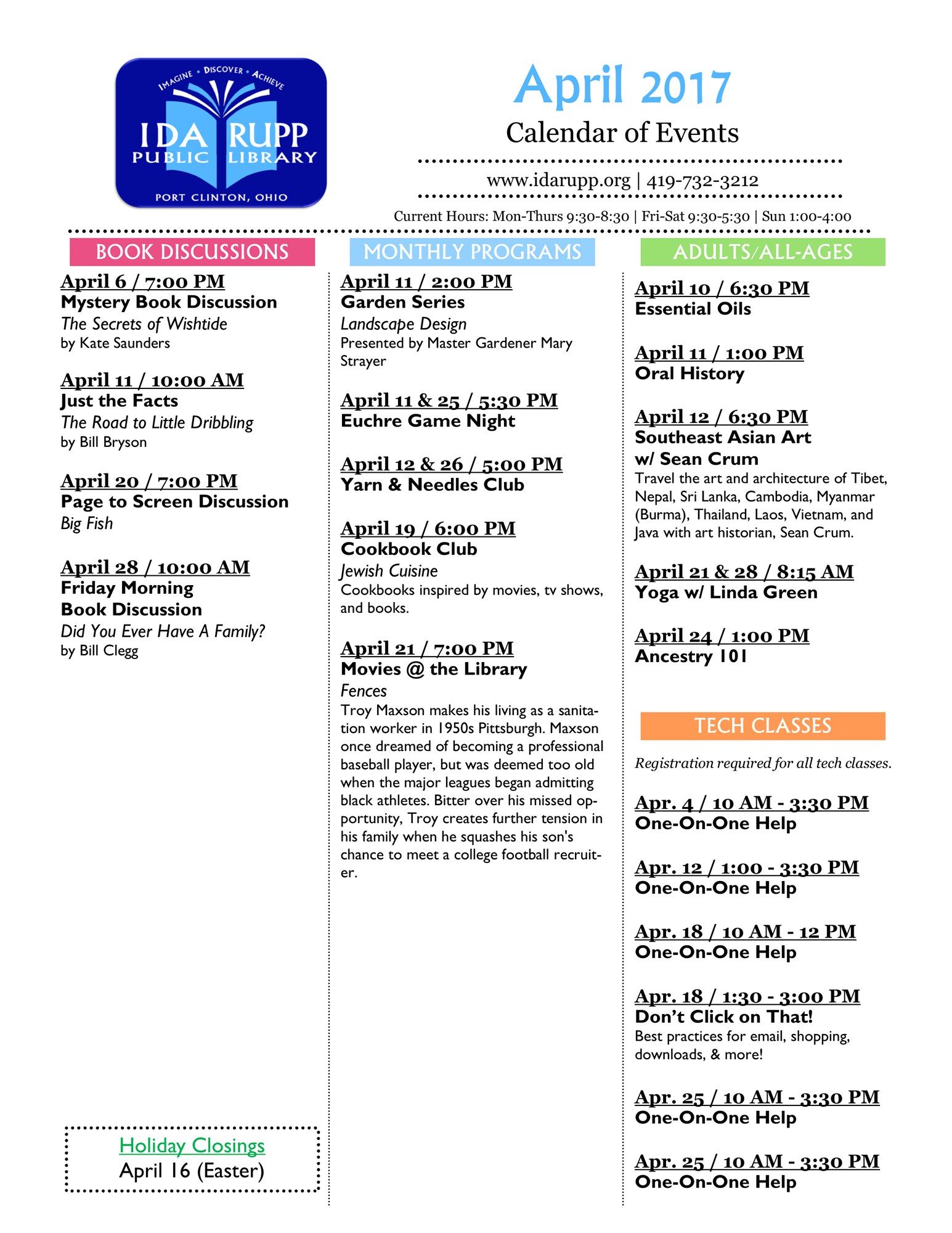 Greetings! I’d like to introduce myself, Judy McKenna, President of the Friends of Ida Rupp Public Library. I’ve asked the Director if we could have a small paragraph in the Newsletter each month and it was welcomed. Mark your calendars for the Annual Book Sale – it will kick off on Wednesday, August 2, 2017 for the Friends from 5:00pm – 7:00pm, as always memberships will be available for purchase at the door. The sale will be open to the public on Thursday, August 3, 2017 from 9:30am – 5:00pm and will wrap up on Friday, August 4, 2017 from 9:30am – 12:00pm. Stay tuned for more news on the Book Sale and Friends activities. Thank you for your continued support!