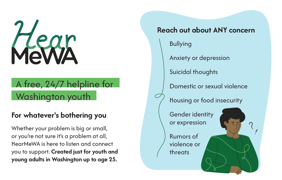 How HearMeWA Can Help HearMeWA connects youth to trained counselors and local resources. It's safe and you can remain anonymous - whatever you're going through, we've got your back.