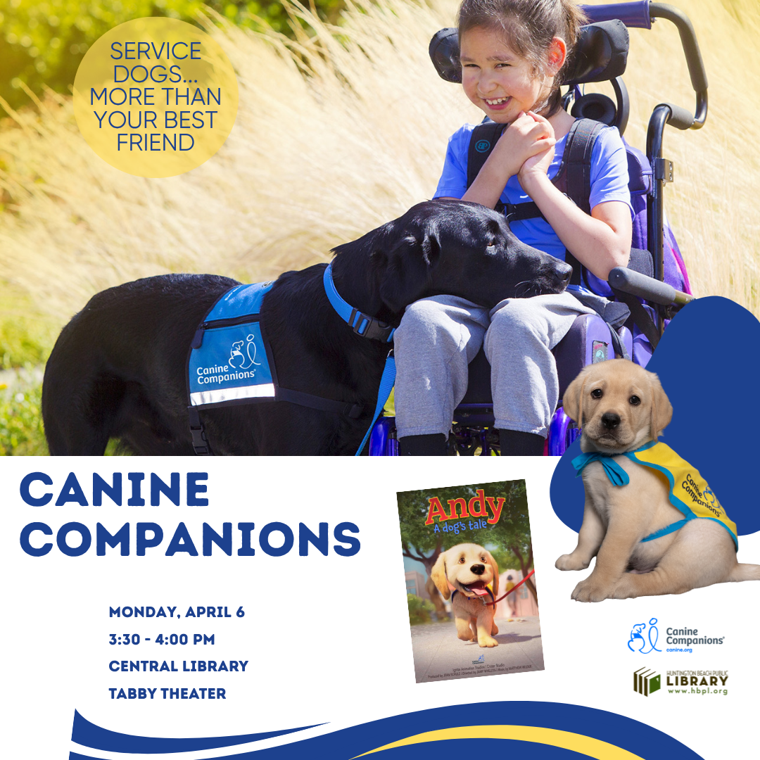 Canine Companions Central Library, Tabby Theater Monday, April 6 from 3:30 - 4:00 p.m Free tickets will be available at the Children's Desk starting at 2:00 pm on the day of the event. First come, first served.