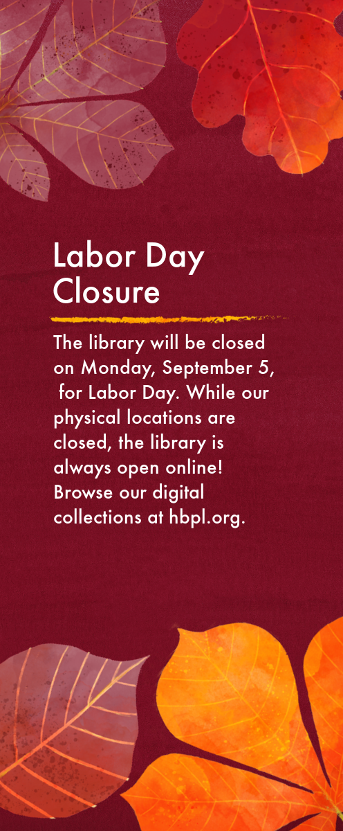 September events for adults @HBPL As we leave summer behind, we're excited to fall into September with events celebrating Hispanic Cultural Heritage Month, like a night of Loteria, our Cultural Cinema Showcase, and an upcoming Agua Fresca Tasting and Workshop! Our Veterans Resource Center will present a special night with guest speakers to help you learn more about supporting your aging loved ones. Enjoy the golden hour during a stroll with our Walking Audiobook Club, or discuss what you're reading with our Silent Book Club! Join our Crafter's Corner to learn a new skill this month, or head over to Central Library during a special Digital Day, a wonderful opportunity to find out more about our online resources and all the services you might not know are available to you with your library card! View it all at-a-glance on our PDF below, and sign up on our website to save your spot. Check out all of our events for adults and register online using the calendar button below!