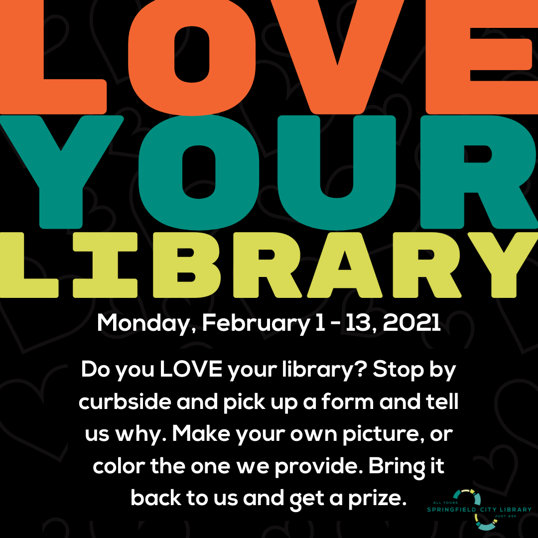 Love Your Library All month! It's Love Your Library Month! Do you love your library? Stop by curbside and pick up a form (or download and print) to tell us why. Make your own picture or color the one we provide. Bring it back to your branch for a small prize!