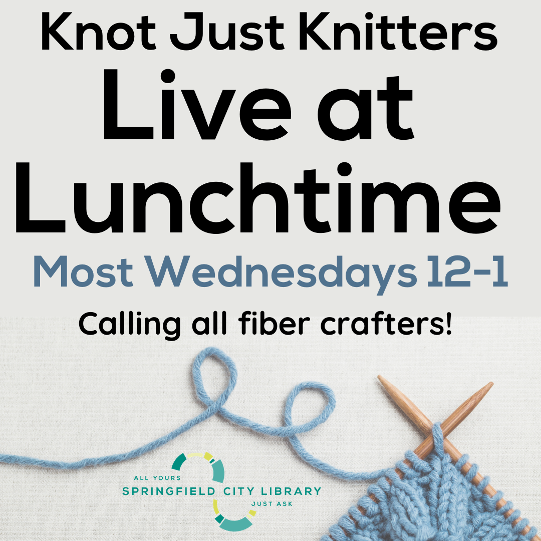 Knot Just Knitters - Live at Lunchtime!Do you secretly wait for lunch to pick up your yarn and knit or crochet a few rows? Then KJK Live at Lunchtime is just what you ordered! Relax and stitch while you catch up with old friends, and make new ones. Are you a beginner, or need help with a pesky pattern? Seasoned needle artists are here to help and to give advice about tools, yarns and techniques. No registration required, just click on the link on our calendar to drop in!