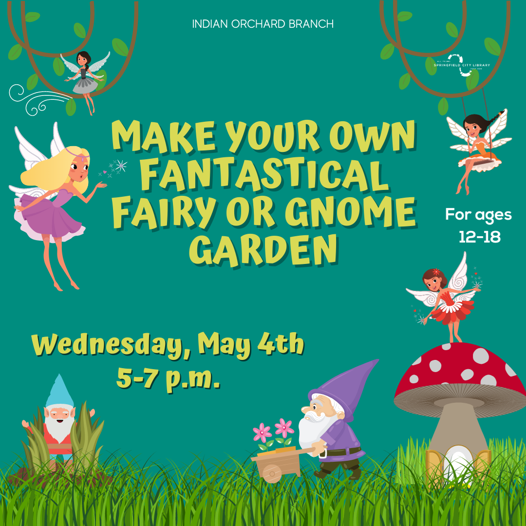 Wednesday, May 4 | 5:00-7:00 PM | Ages 12-18| Indian Orchard Branch Welcome Spring with your own Fantastical Fairy or Gnome Garden. Using natural and supplied figures create a magical space for a gnome or fairy. Supplies are limited, so preregistration is strongly encouraged. Pre-register here!