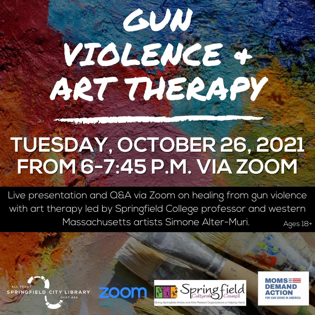 Springfield College professor and freelance visual artist Simone Alter-Muri presents on gun violence and how art therapy can aid healing. 2020 was the deadliest gun violence year in decades (Washington Post, June 14, 2021). Hear how art therapy can promote healing in both individuals and in the community, and meet other local community members concerned about gun violence. A question and answer will follow the presentation. For adults 18+.