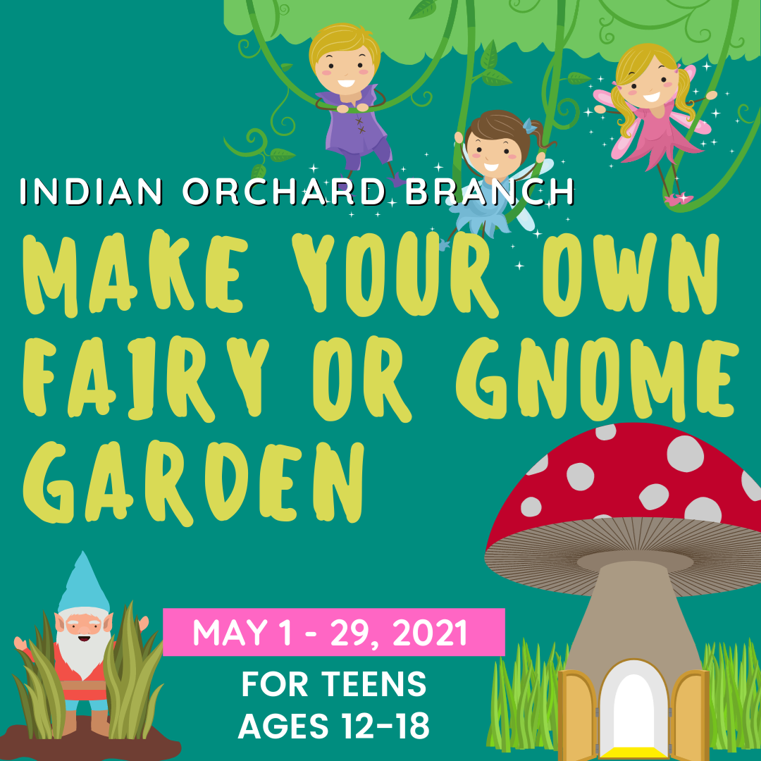 Make Your Own Fairy or Gnome Garden May 1-29 | Teens 12-18 Welcome Spring with your own Fairy or Gnome Garden! Using natural and supplied figures, create a magical space for a gnome or fairy. Please register – supplies are limited. We will call you to pick up your supplies curbside at the Indian Orchard Branch.