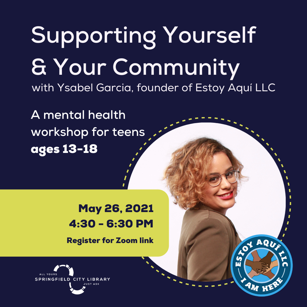 Mental Health Workshop Wednesday, May 26 | 4:30 – 6:30 pm | Teens 13-18 We will learn what Community Care is and how we can use it to support our friends and family who are experiencing mental distress.