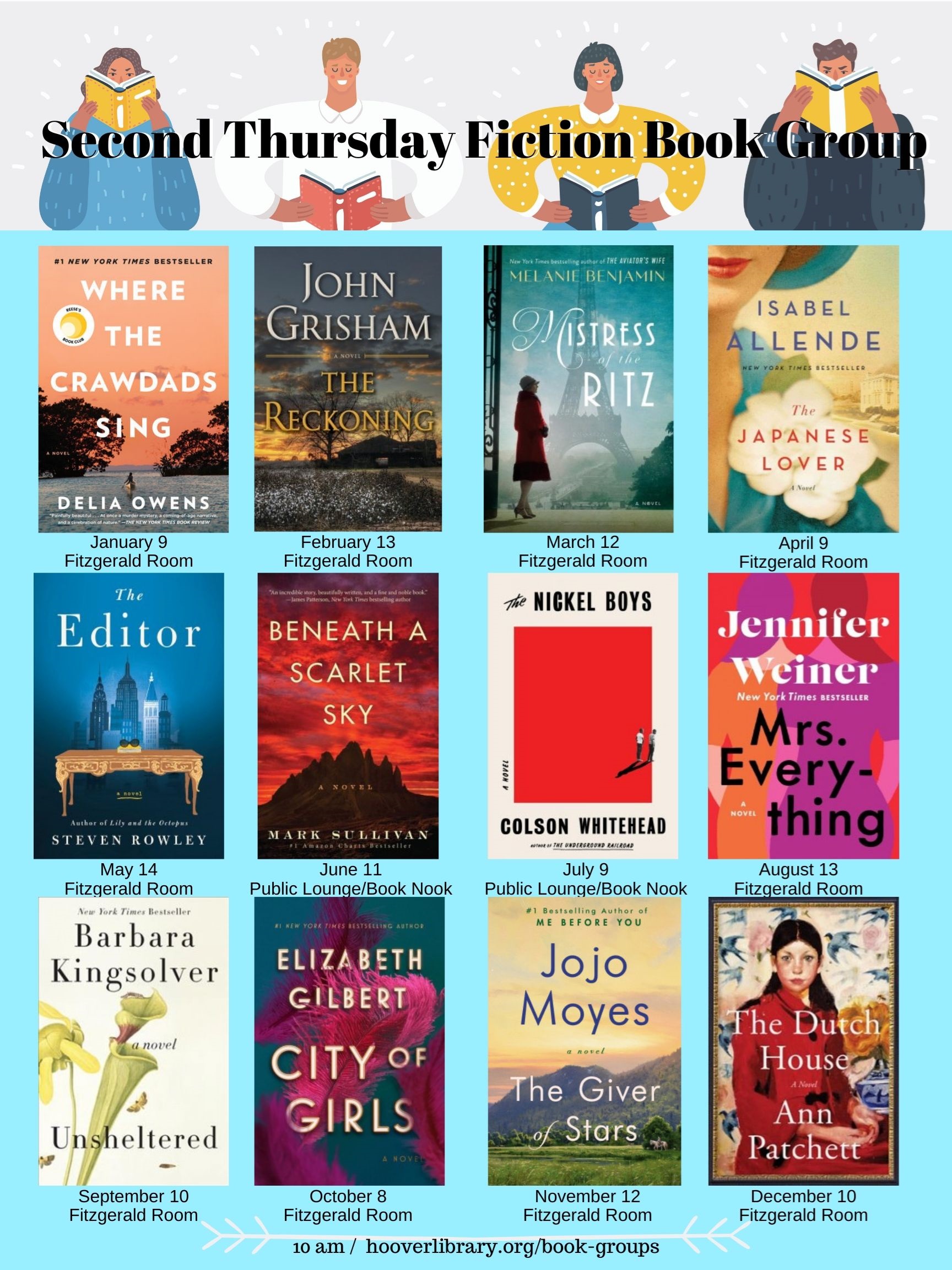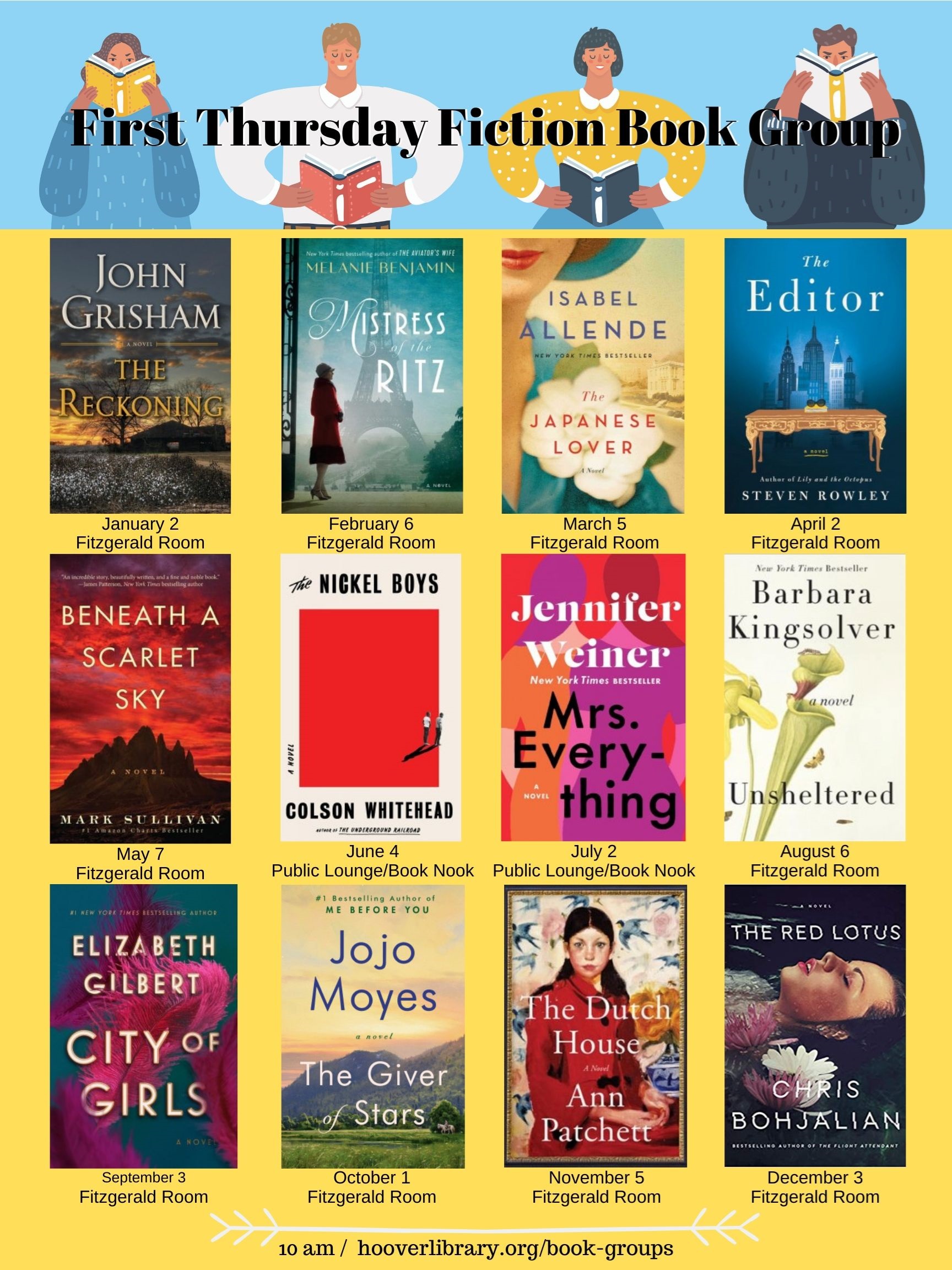 First Thursday Fiction Book Group: Thursday, March 5, 10 am Fitzgerald Room Second Thursday Fiction Book Group: Thursday, March 12, 10 am Fitzgerald Room