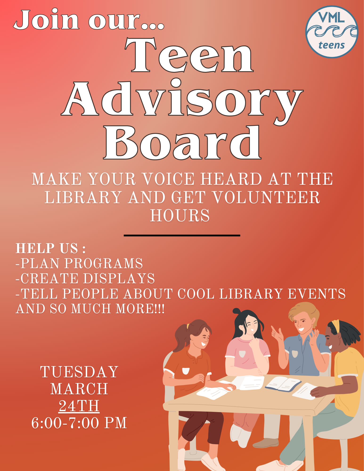 Tuesday, March 24th, 6:00-7:00 p.m. The Ventress Memorial Library Teen Zone will be having monthly Teen Advisory Board (TAB) meetings. The advisory board will help plan and implement programs and help shape the future direction of Teen Services at the Library. Attendance at these meetings can be counted towards volunteer hours, but to do so, make sure to fill out our volunteer form! For grades 6-12 only. Registration appreciated.