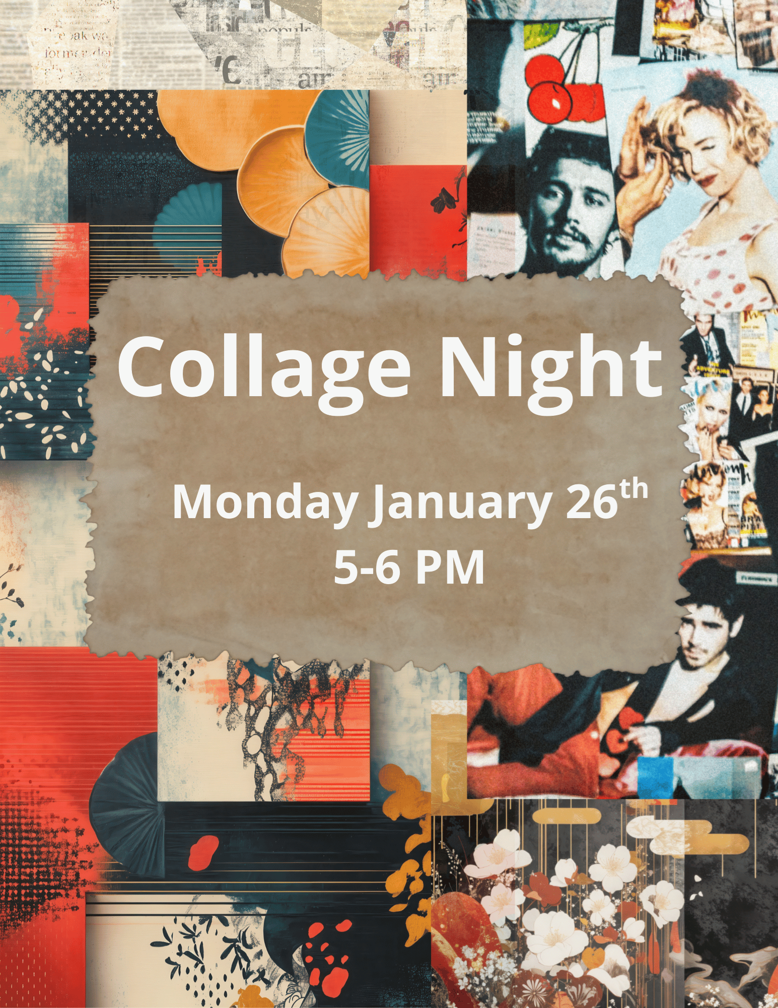 Monday, January 26th, 5:00-6:00 p.m. The library will provide a variety of materials for you to create a wonderful collage! Snacks and drinks will be provided. Grades 6-12 only.