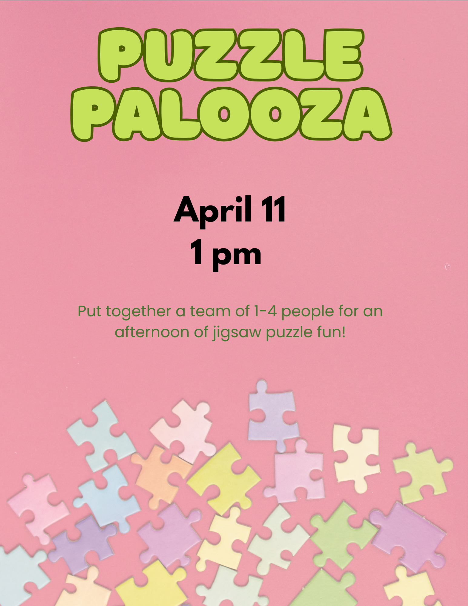 Saturday, April 11th, 1-3 p.m. Back for a second month! Join us for an afternoon of jigsaw puzzle fun! There will be snacks and participation gifts, as well as prizes for the fastest finishers. Register your team of 1-4 people. Ten team slots available! If you are a solo puzzler who would like to be paired up with others on a team, email ssmee@marshfield.ocln.org.
